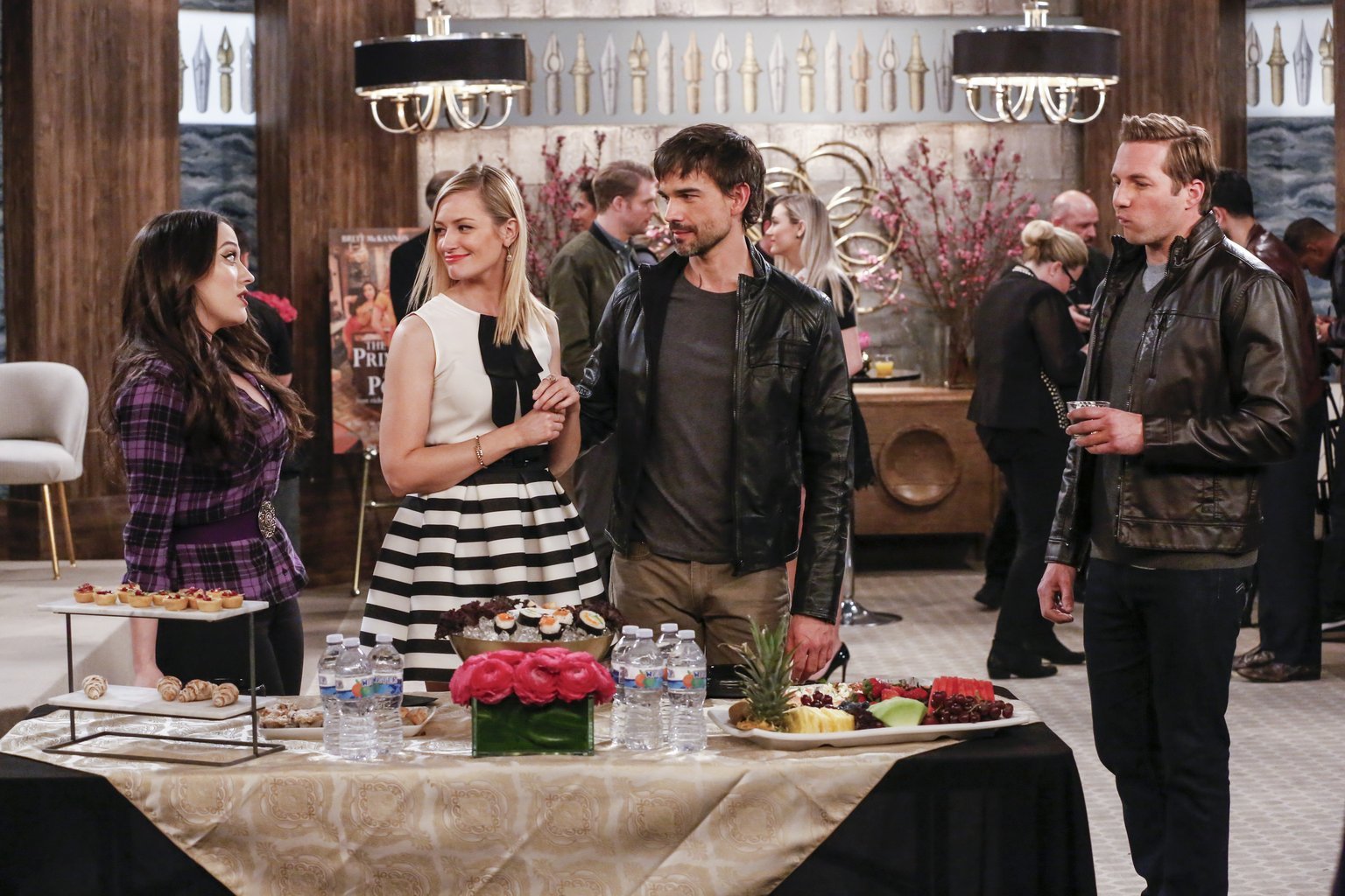 Can-Drew AndrewEigentlich wollten Max (Kat Dennings, l.) und Caroline (Beth Behrs, 2.vl.) nur den Film über Carolines Leben promoten, doch dann treffen sie bei der Veranstaltung auf Andy (Ryan Hansen, r.), was bei Bobby (Christopher Gorham, 2.v.r.) für eine Menge Eifersucht sorgt ...Bild: © Warner Bros. Television