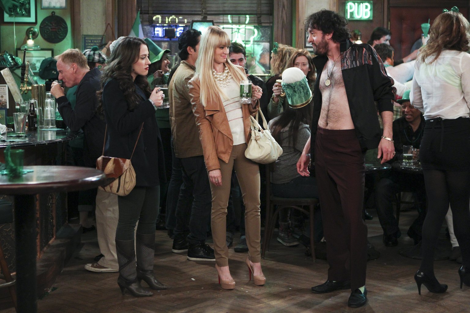 Scotch und FischEs ist St. Patrick's Day und die Party ist im vollen Gange, doch Max (Kat Dennings, l.) und Caroline (Beth Behrs, M.) sind immer wieder von Oleg (Jonathan Kite, r.) und seinem Verhalten überrascht ...Bild: © Warner Bros. Television Lizenzbild frei