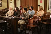 Junge oder MädchenNachdem Sophie (Jennifer Coolidge, 2.v.r.) Max (Kat Dennings, 2.v.l.) und Caroline (Beth Behrs, M.) den Umschlag, der das Geschlecht ihres Babys enthält, übergeben hat, wollen die beiden ihr, Oleg (Jonathan Kite, l.) und Earl (Garrett Morris, r.) endlich verraten, was es wird ...Bild: © 2016 Warner Brothers Lizenzbild frei