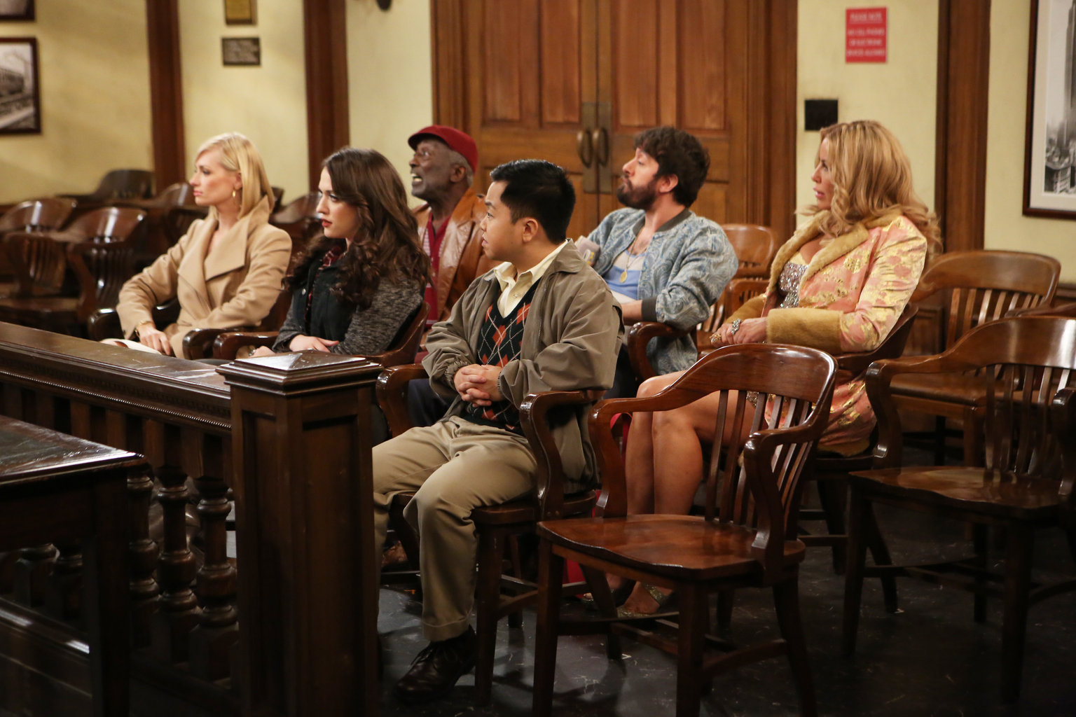 Der traurige PartybusNach ihrem teils freudigen und teils traurigen Ausflug nach L.A. freuen sich Max (Kat Dennings, M.) und Caroline (Beth Behrs, r.), zusammen mit Han (Matthew Moy, l.), für Oleg (Jonathan Kite, 2.v.l.) und Sophie (Jennifer Coolidge, 2.v.r.), als diese ihm eine überwältigende Neuigkeit verkündet ...Bild: © 2016 Warner Brothers