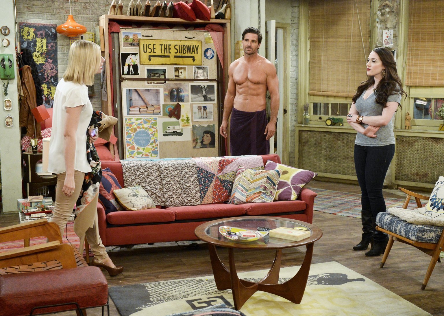 Das HintertürchenCaroline (Beth Behrs, l.) erwischt Max (Kat Dennings, r.) und Randy (Ed Quinn, M.) in trauter Zweisamkeit und macht sich daraufhin Sorgen, dass ihre Freundin erneut verletzt werden könnte. Die sieht das jedoch nicht ganz so kritisch ...Bild: © 2016 Warner Brothers
