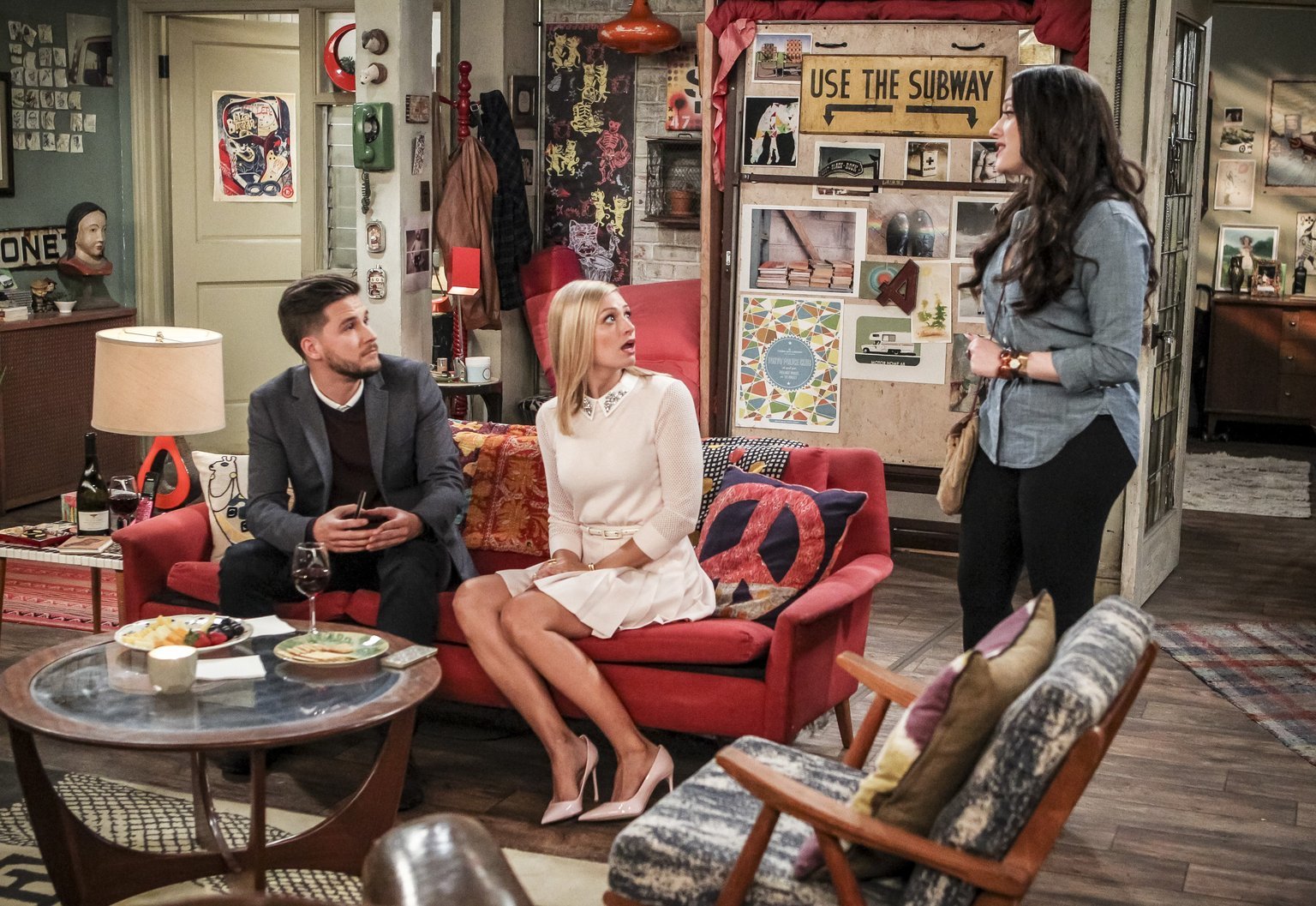 Hoffnung für CarolineMax (Kat Dennings, r.) und Randy sind genervt von Caroline (Beth Behrs, M.) und organisieren für sie ein Date mit dem charmanten Tyler (Devon Werkheiser, l.). Wird das wirklich gut gehen?Bild: © Warner Bros. Television Lizenzbild frei
