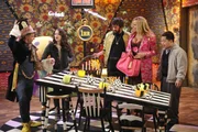 Der MietbetrugUm die Mitarbeiter des Diners als Team zusammenzubringen, hat sich Han (Matthew Moy, r.) etwas ganz Besonderes ausgedacht: Max (Kat Dennings, 2.v.l.), Oleg (Jonathan Kite, 3.v.r.) und Sophie (Jennifer Coolidge, 2.v.r.) sollen zusammenarbeiten und unter der Leitung von Randy (John Milhiser, l.) aus einem Escape-Room ausbrechen ...Bild: © Warner Brothers Lizenzbild frei