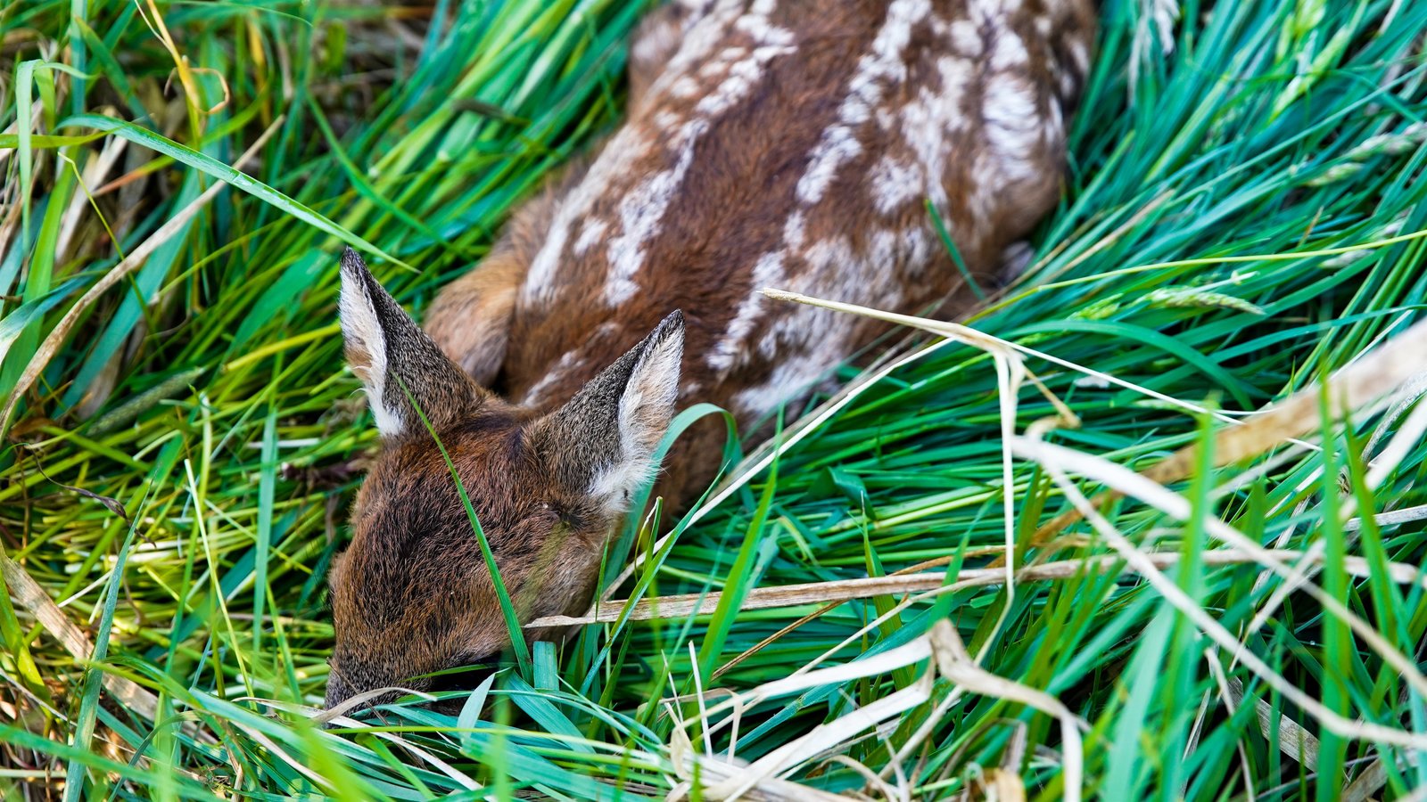 Jagdfieber - Die neue Lust an der PirschRettung vor den tödlichen Klingen: Am Waldrand wird das Rehkitz auf Grasbüscheln abgelegt. Dort wird es die Mutter-Geis finden.Bild: © ZDF und Marcel Martschoke.
