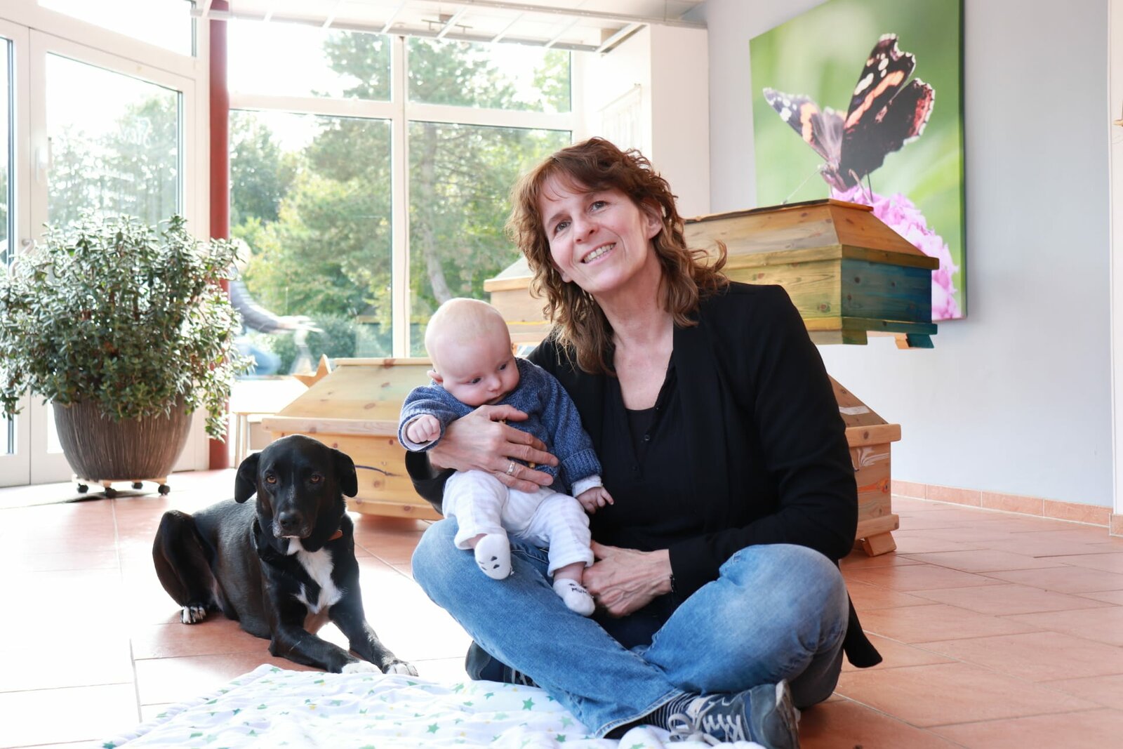 Vom Anfang und Ende des Lebens - Arbeiten als Hebamme und BestatterinEllen Matzdorf ist Bestatterin und Hebamme. Hier mit dem kleinen Levi und ihrem Hund Bubi.Bild: © ZDF und Reinhard Bettauer.