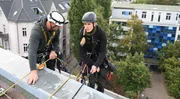 Job mit Ausblick - Arbeiten in luftigen HöhenRafaela und Maik lassen sich von einem Berliner Wohnhaus hinab. Bevor sie über die Kante gehen, überprüfen sie nochmals die Sicherungsseile. Jeder Fehler kann tödlich sein.Bild: © ZDF und Enrico Demurray.