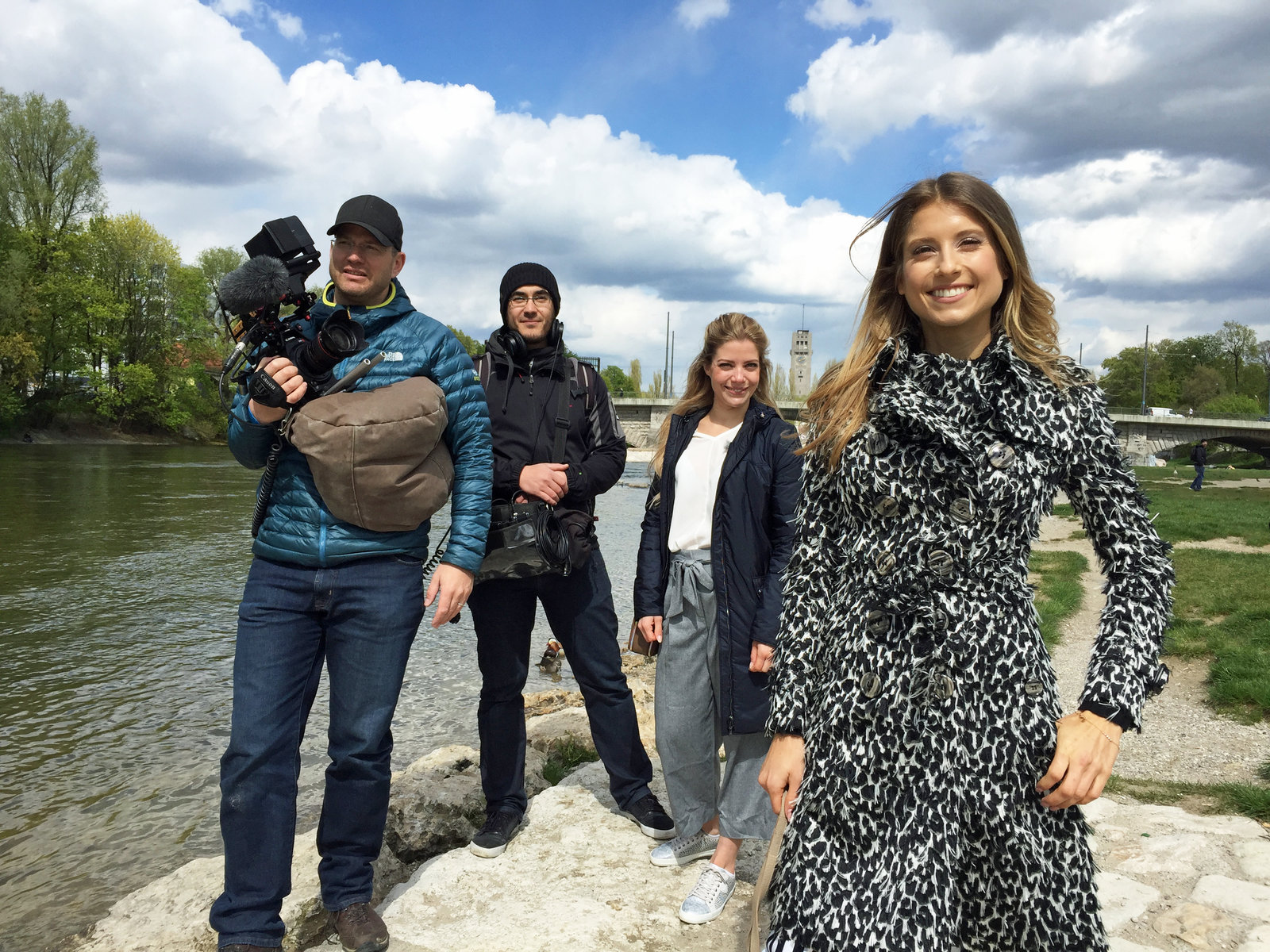 Plötzlich im Flutlicht - Vom Leben als SpielerfrauCathy Hummels und das Kamerateam bei Dreharbeiten in München an der Isar.Bild: © ZDF und Süddeutsche TV GmbH