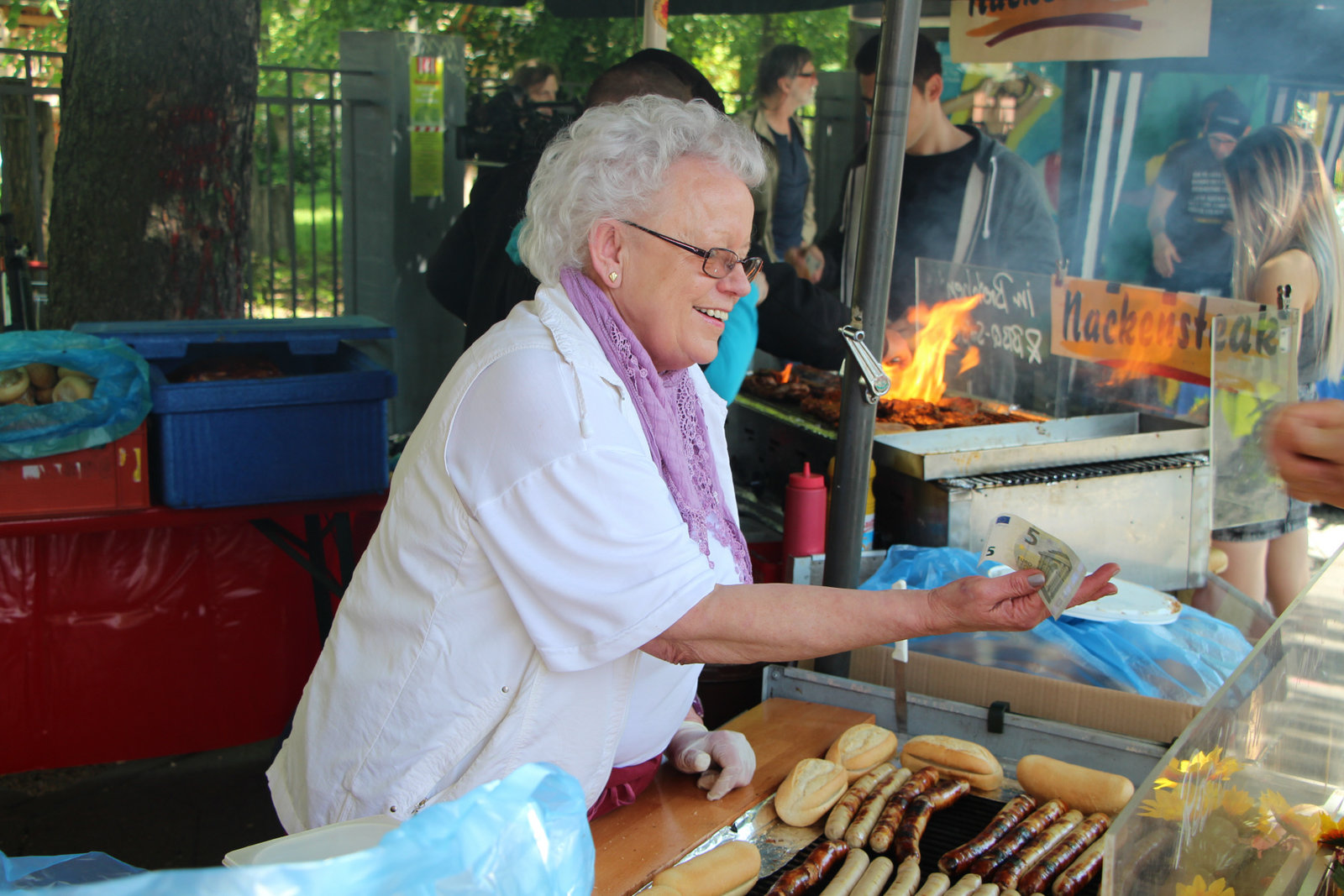 Schuften bis zum Schluss - Arme Rentner im reichen DeutschlandRentnerin Heidi steht stundenlang vor dem heißen Grill. Sie ist auf den Job angewiesen. Von ihrer Rente kann sie nicht leben.Bild: © ZDF und Enrico Demurray