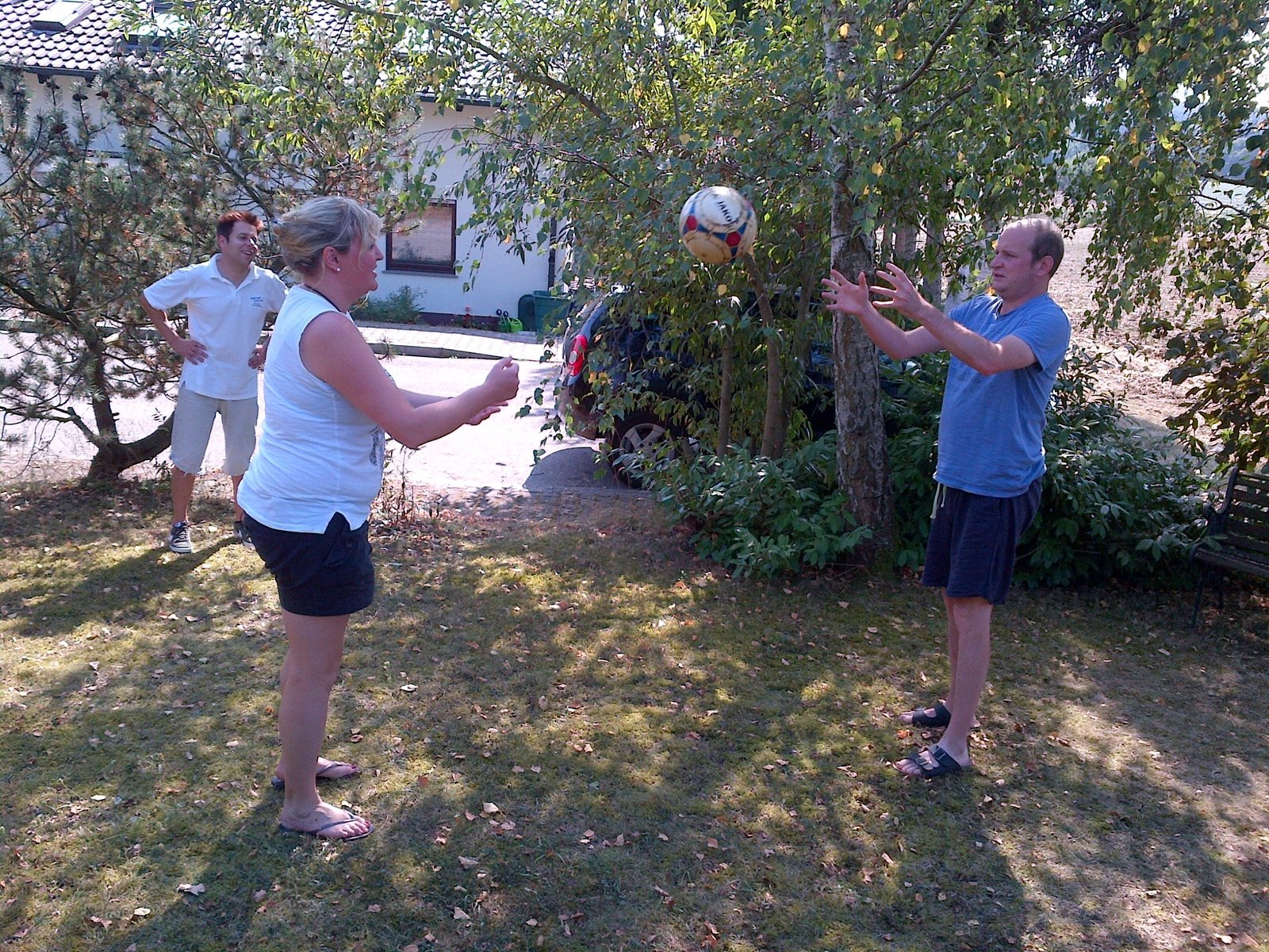 Das große Vergessen - Demenz bei jungen MenschenFlorian H., 41 (r.), ist an Demenz erkrankt. Mit seiner Schwester spielt er Ball im Garten seiner Eltern, beobachtet von Florians Pfleger.Bild: © ZDF und Walter Krieg