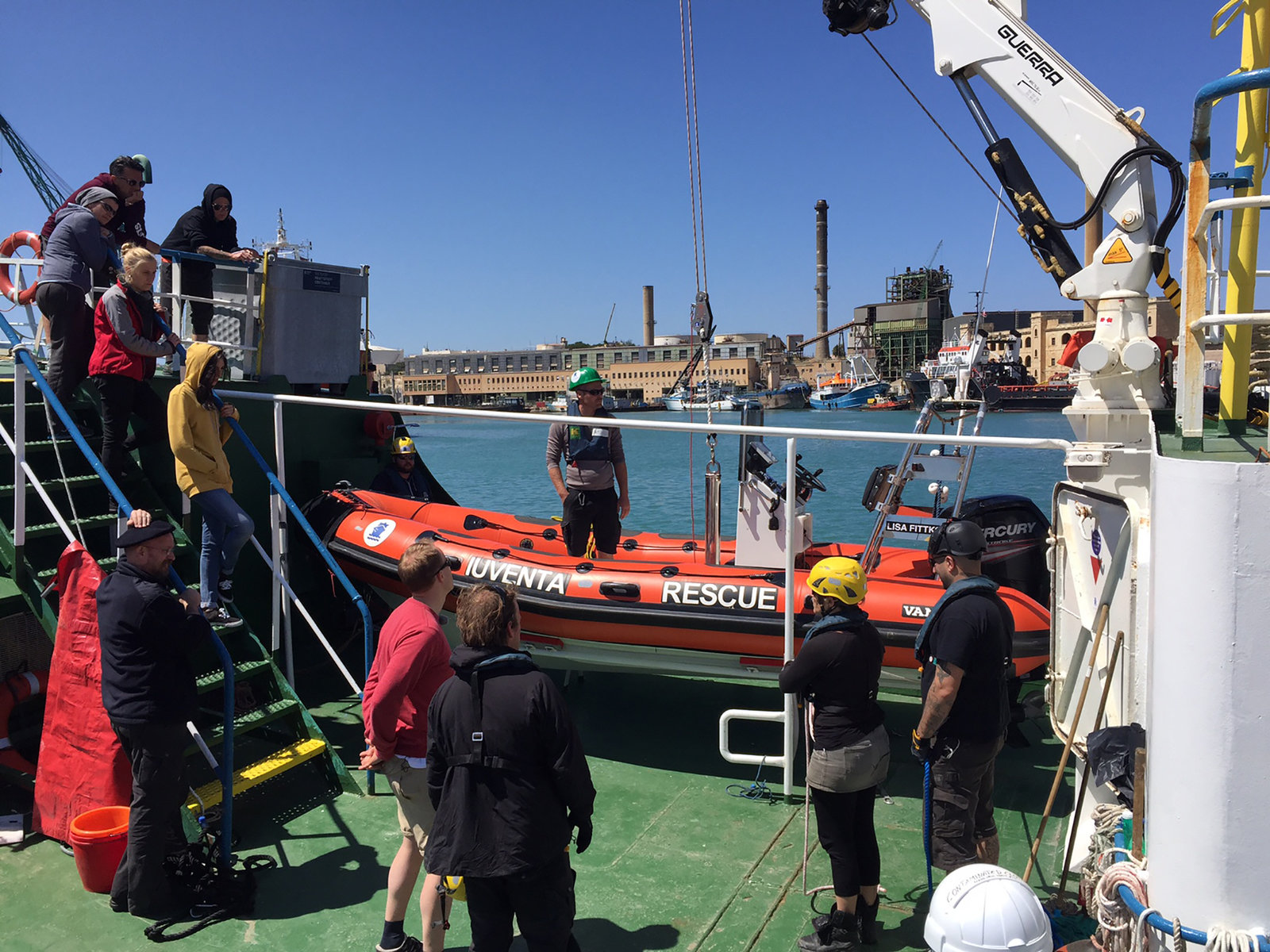 Rettung in letzter Sekunde - Titus' gefährliche MissionDie Crew bei der Sicherheitseinweisung. Geht alles gut und kann die Juventa ausfahren?Bild: © ZDF und Nathalie Suthor
