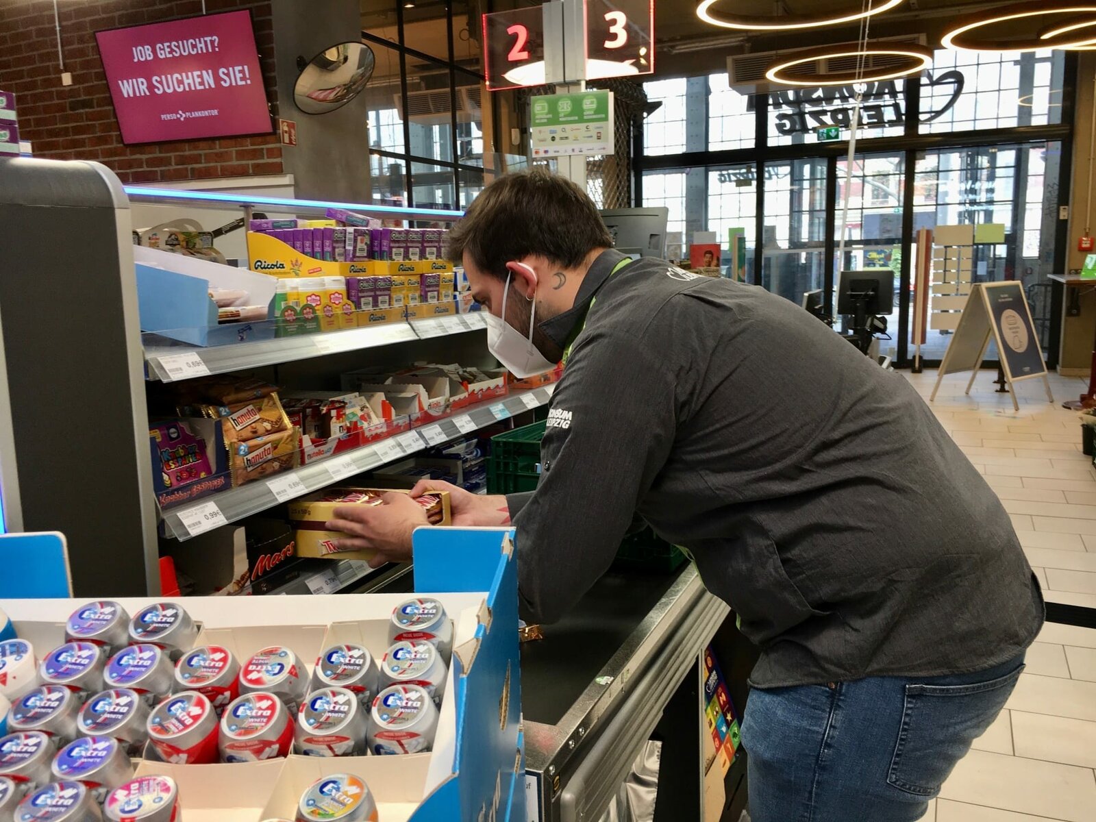 Da kannst du einpacken - Verkäufer*innen im EinsatzJeder der 20 Mitarbeiter des Supermarktes muss alles machen, ob Ware einräumen, Kassieren, Brötchen schmieren, Büroarbeit oder auch Putzen.Bild: © ZDF und Tina Radke-Gerlach.