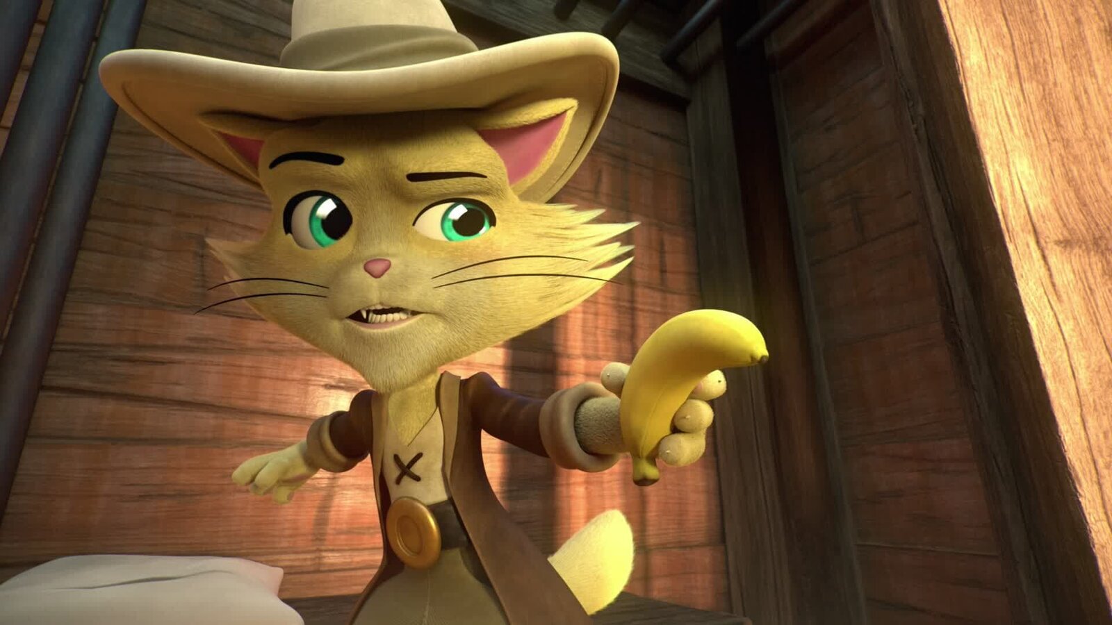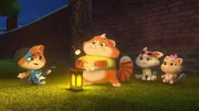 Die AngstkatzeLampo erlaubt sich einen Scherz und erzählt Pilou von einem Monster, das in der Dunkelheit leben soll und jagt der kleinen Katze damit ungewollt große Angst ein.Bild: © SUPER RTL