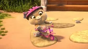 Ein Roller für PilouPilou hat Schwierigkeiten mit dem Roller zu fahren. Sie kann kaum ihr Gleichgewicht halten. Ist das Rollerfahren doch schwerer und gefährlicher als sie gedacht hatte?Bild: © SUPER RTL