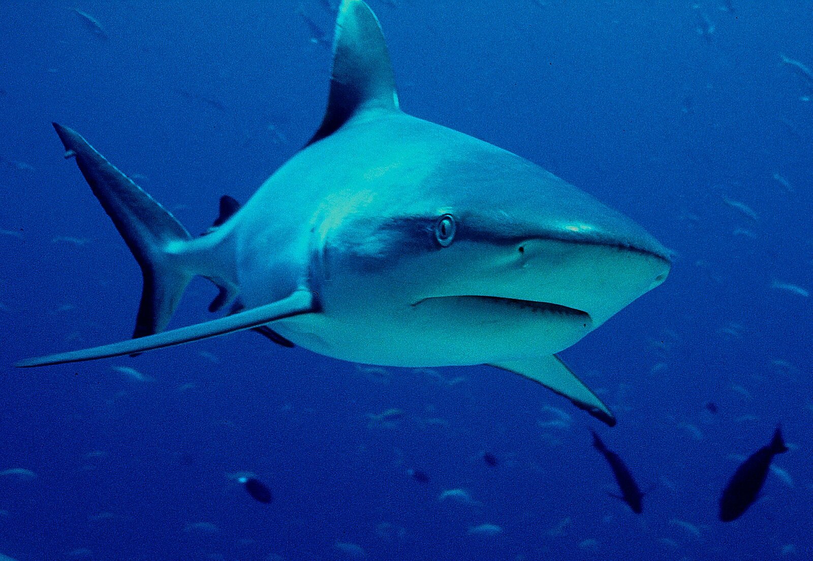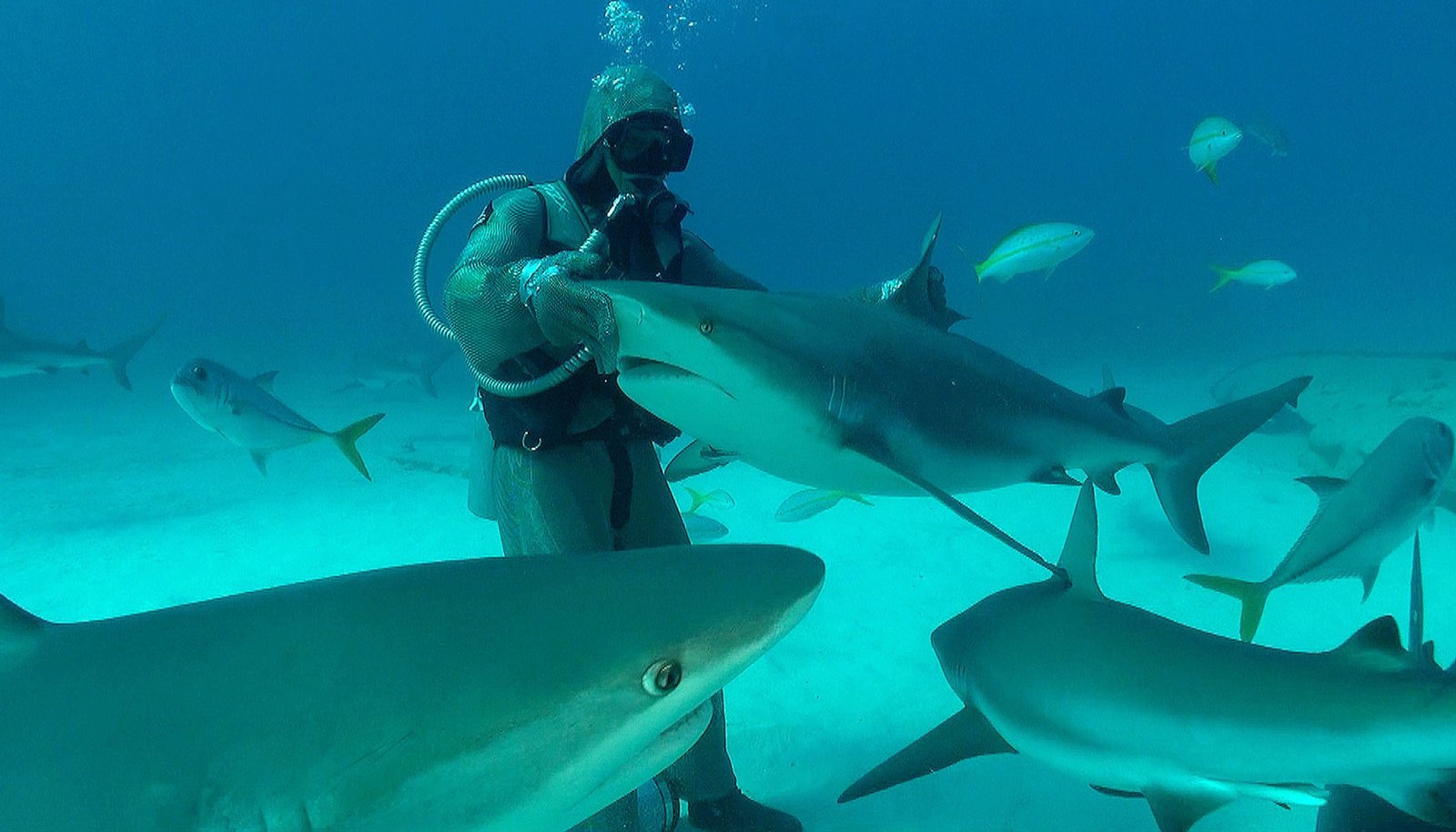 Neues aus der Hai-SocietyTaucherin mit einem karibischem Riffhai.Bild: © BR/WDR/Sigurd Tesche