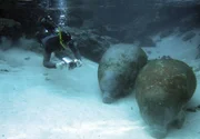 Manatis mögen's heiß - Floridas SeeküheDie Meeressäuger lassen sich bei der Futtersuche am Flussgrund vom Tierfilmer nicht stören.Bild: © BR/NDR/NDR Naturfilm/Christina Karliczek