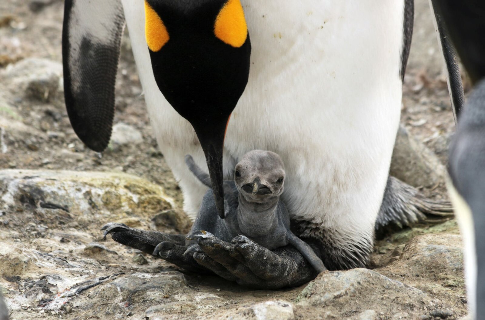 Weihnachten in der WildnisRund um Weihnachten schlüpfen auf der Insel Südgeorgien die Königspinguine. Die ersten Wochen ruhen sie auf den Füßen der Eltern.Bild: © ZDF und SWR/Roland Gockel.