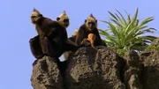 In den Urwäldern VietnamsNachwuchs bei den Goldkopflanguren in den Felsen der Ha Long-Bucht. Die Babys mit dem leuchtend goldenen Fell sind für die Artenschützer immer wieder ein Hoffnungsschimmer.Bild: © BR