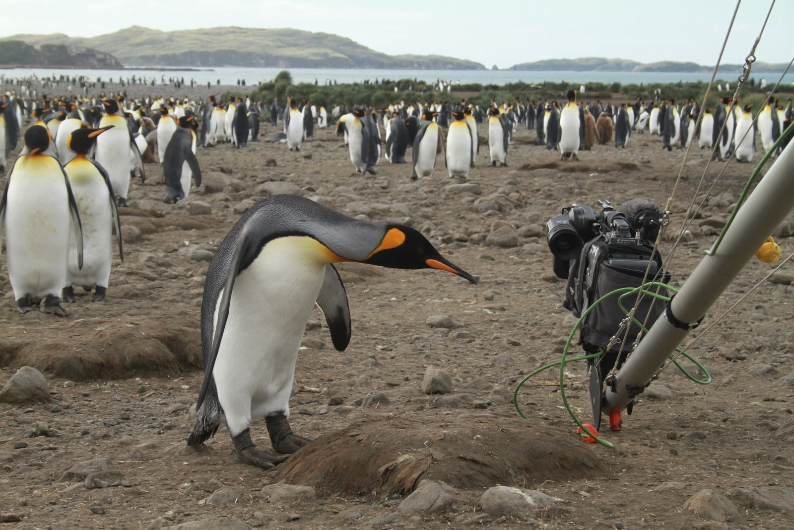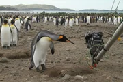 Die Rettung der PinguininselSouth Georgia Island, making off, technisch interessierter Königspinguin vor der Kamera.Bild: © ZDF und BR/Roland Gockel