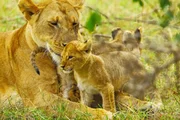 Löwen - Das wahre Leben der RaubkatzenLöwenjunge bleiben ca. zweieinhalb Jahre in der Obhut ihrer Mutter. Gesäugt werden sie allerdings auch von den anderen Weibchen im Rudel.Bild: © BR/NDR/Reinhard Radke