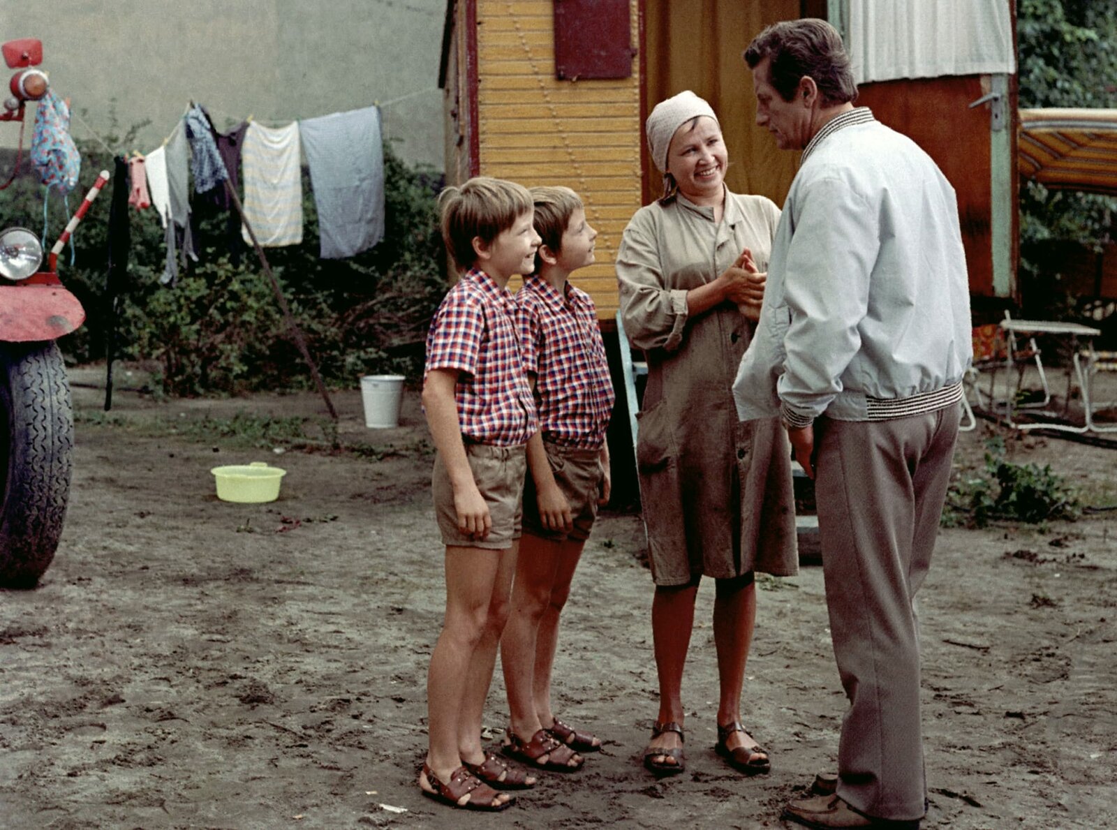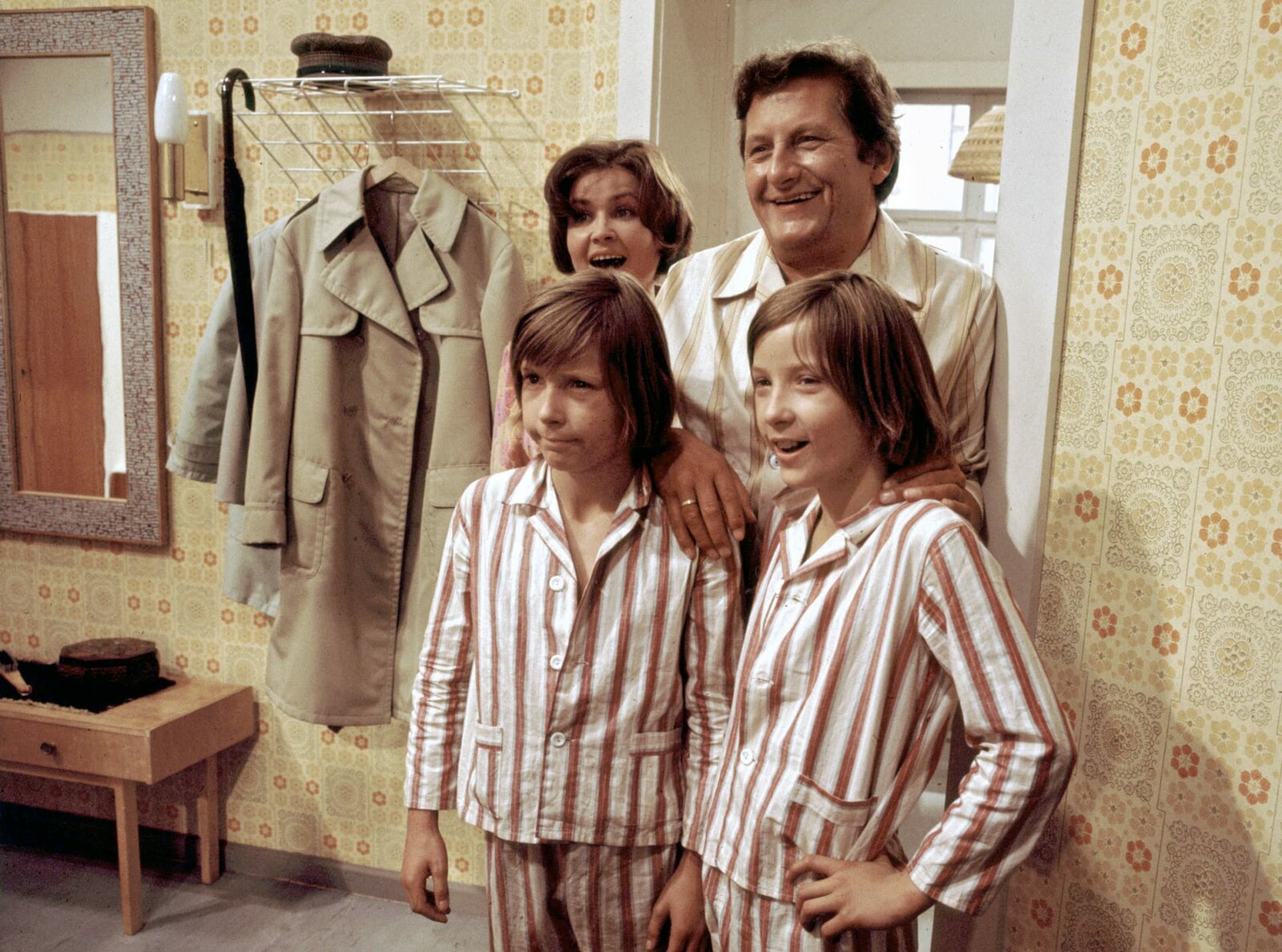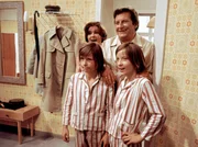 Vati hat geheiratetSeit etwa einem halben Jahr haben die Zwillinge Kalle (Ralf Lemcke) und Kulle (Rolf Lemke, r.) nicht nur eine Mutter (Helga Labudda), von der sie einfühlsam und konsequent erzogen werden, sie haben auch eine Schwester. Gibt es Meinungsverschiedenheiten, dann hält Fränze zum Vater (Erik S. Klein) und die Jungen prompt zur Mutter.Bild: © MDR/DRA/Teschner