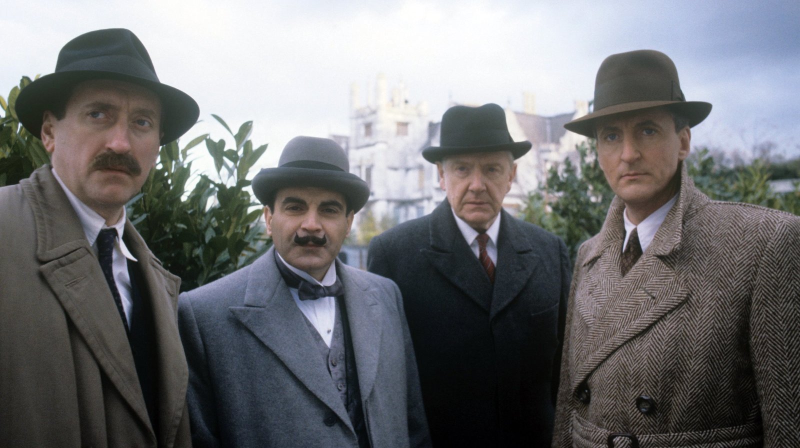 Im Namen der Nationv.l.n.r. Chief Inspector Japp (Philip Jackson), Hercule Poirot (David Suchet), Sir Bernard Dodge (Roland Hines) und Captain Hastings (Hugh Jackson).Bild: © WDR/ITV plc (Granada Internation