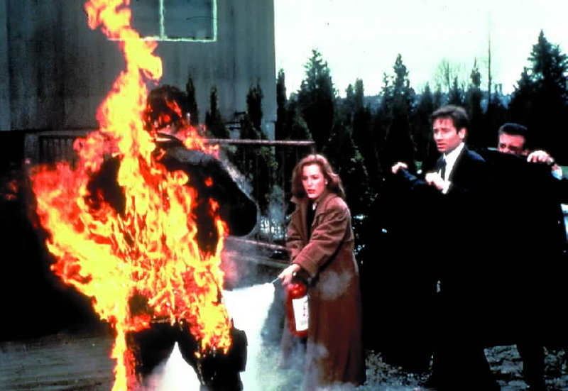 Dana Scully (Gillian Anderson) ist skeptisch, als Fox Mulder (David Duchovny) den Flugzeugabsturz auf eine Begegnung der dritten Art zurückführt.