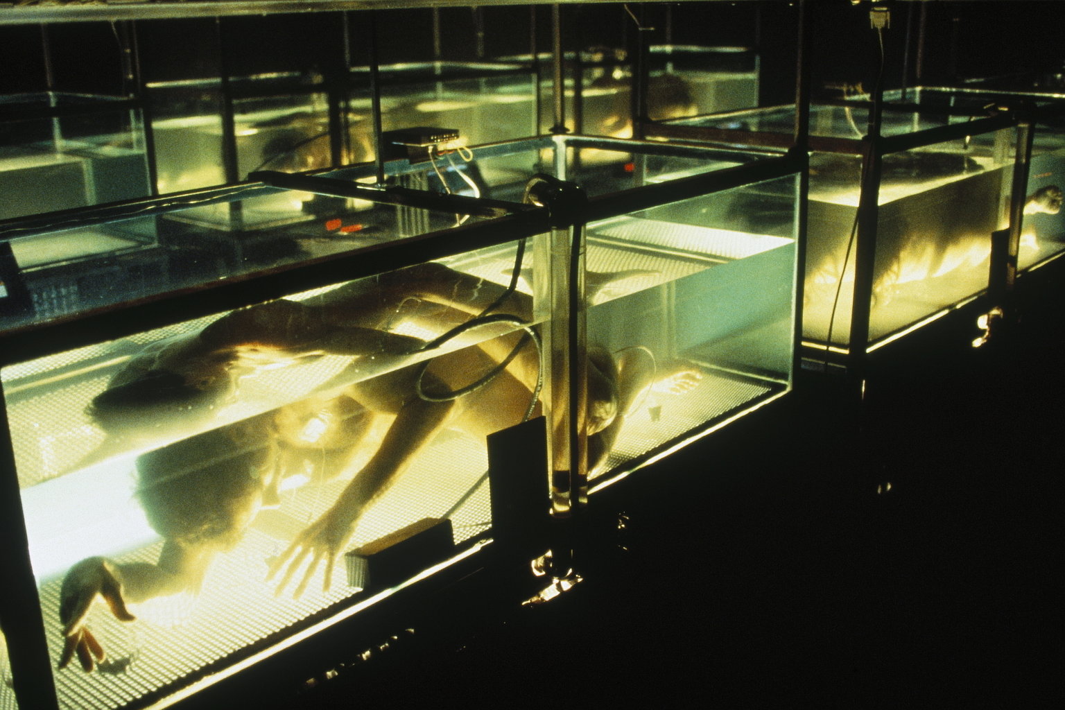 In einem scheußlichen Versuchslabor werden menschliche Körper, die unter Wasser atmen können, in Bassins gehalten ...