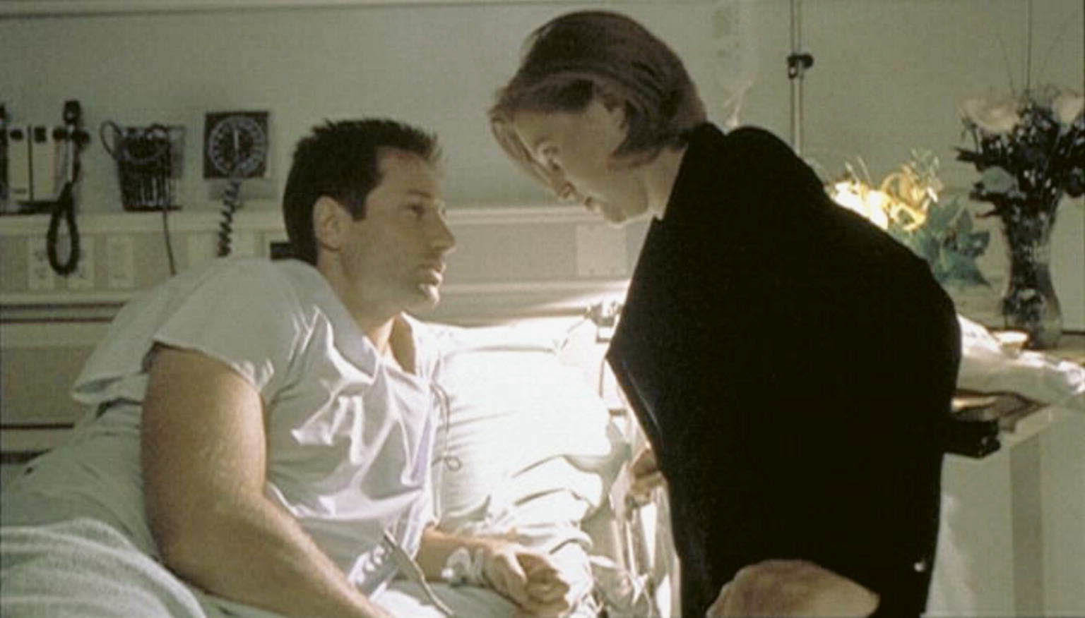 Als Mulder (David Duchovny, li.) im Krankenhaus aufwacht und von seinen Abenteuern aus dem Jahre 1939 erzählt, glaubt Scully (Gillian Anderson), dass er nun völlig übergeschnappt ist.