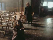 Scully (Gillian Anderson, hinten) muss entsetzt erkennen, dass sie den Tod der behinderten Roberta (Emily Perkins, vorne) nicht abwenden kann.