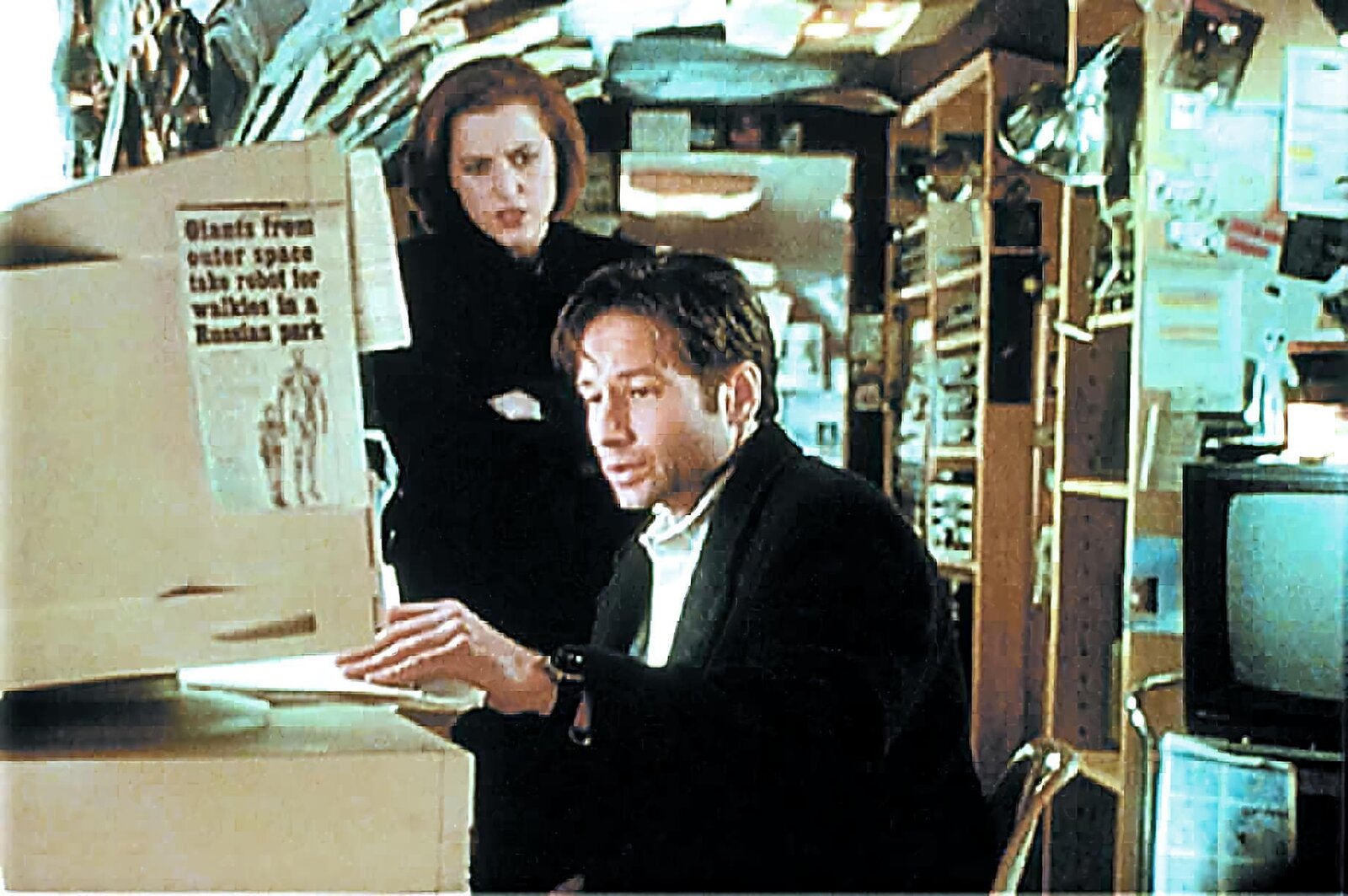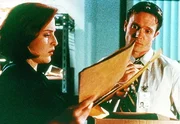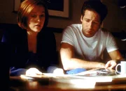 Scully (Gillian Anderson) und Mulder (David Duchovny, r.), die gerade die Autopsieberichte einer Mordserie studieren, merken nicht, dass sie dabei von Mulders Nachbarn beobachtet werden.