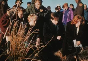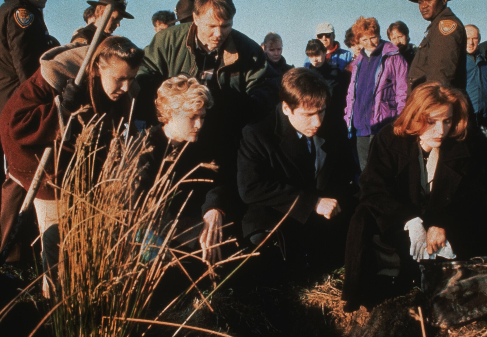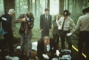 Die örtliche Polizei und die beiden FBI-Agenten Scully (Gillian Anderson, Mitte r.) und Mulder (David Duchovny, Mitte l.) entdecken in einem Waldstück mysteriöse Leichenteile.