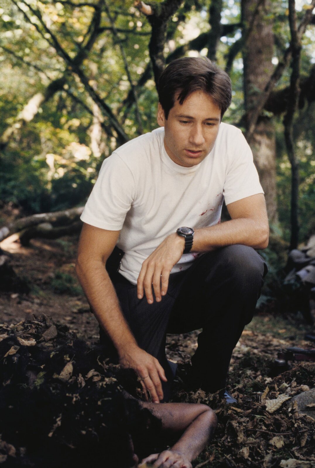 Der FBI-Agent Mulder (David Duchovny, l.) und Larry Moore (Jason Beghe, r.) von der Forstverwaltung stehen fassungslos vor der Leiche ihres Mitstreiters.