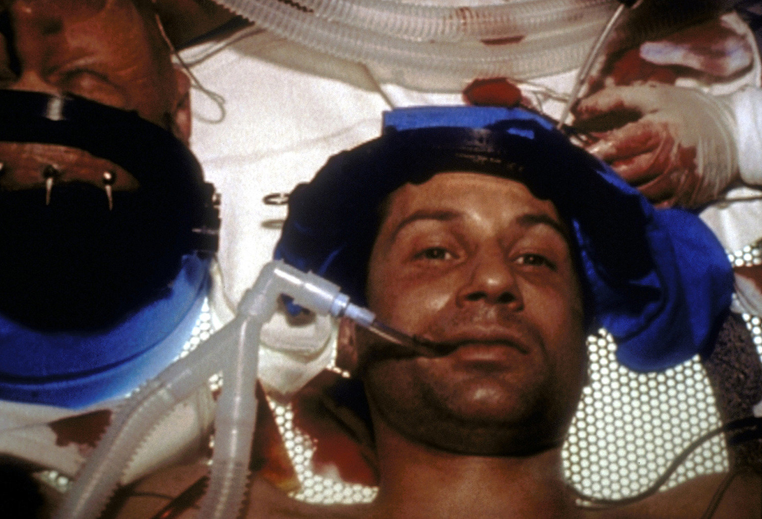 Tausend StimmenIn einer geheimen Forschungseinrichtung wird Mulder (David Duchovny, r.) Genmaterial entnommen, das dann dem Raucher (William B. Davis, l.) implantiert wird.Bild: © TM + © 2000 Twentieth Century Fox Film Corporation. All Rights Reserved. Lizenzbild frei
