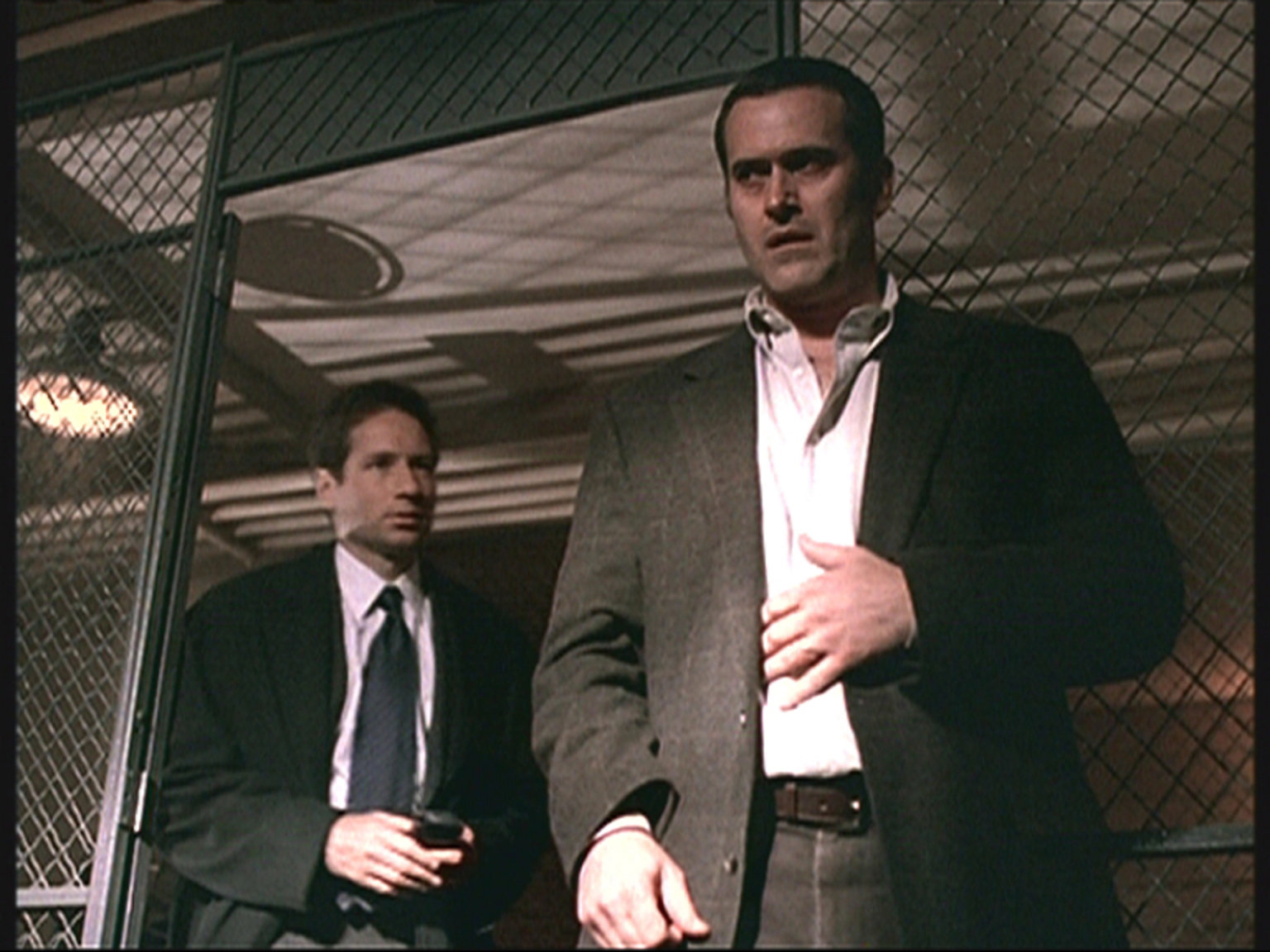 Zeit der ZärtlichkeitMulder (David Duchovny, l.) hegt den Verdacht, dass der Versicherungsvertreter Wayne Weinsider (Bruce Campbell, r.) in Wirklichkeit ein Dämon ist.Bild: © TM + © 2000 Twentieth Century Fox Film Corporation. All Rights Reserved. Lizenzbild frei