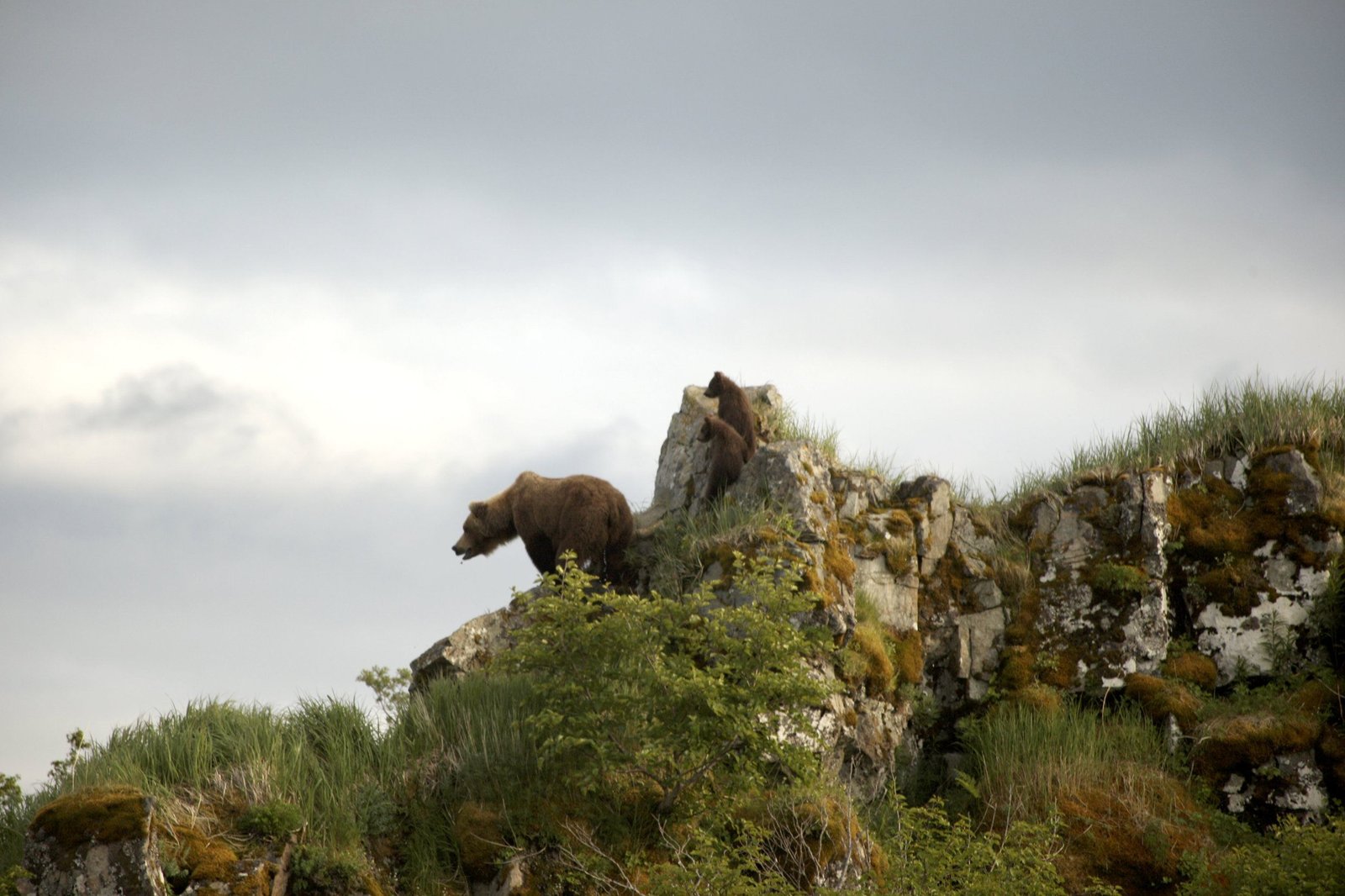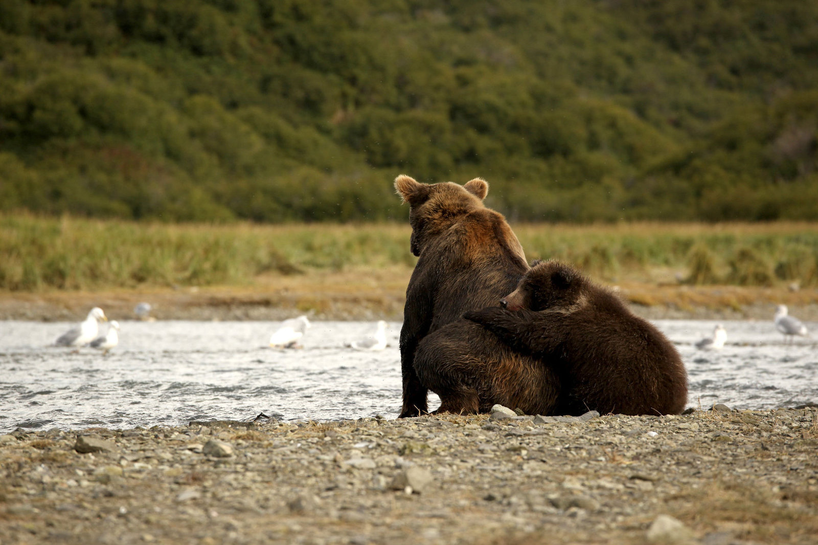 Die Reise in den NordenAus sicherer Höhe beobachten Nadie und ihre Kinder das wilde Treiben im Tal: Kolossale Männchen kämpfen dort um die Gunst der Weibchen. Es ist Paarungszeit bei den Grizzlybären.Bild: © HR/NDR/Joseph Pontecorvo