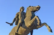 Bis ans Ende der WeltBis heute ist Alexander der Große in Griechenland allgegenwärtig: Modernes Reiterstandbild an der Uferpromenade von Thessaloniki.Bild: © PHOENIX/ZDF/Martin Carazo Mendez