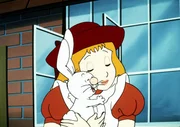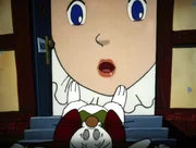 Das Haus des weißen KaninchensAlice hat im Haus des großen weißen Kaninchens genascht und wurde so riesig, dass sie nicht mehr durch die Tür passt. Vor Schreck und Sorge um sein Haus fällt das große weiße Kaninchen in Ohnmacht.Bild: © ZDF/Apollo-Film