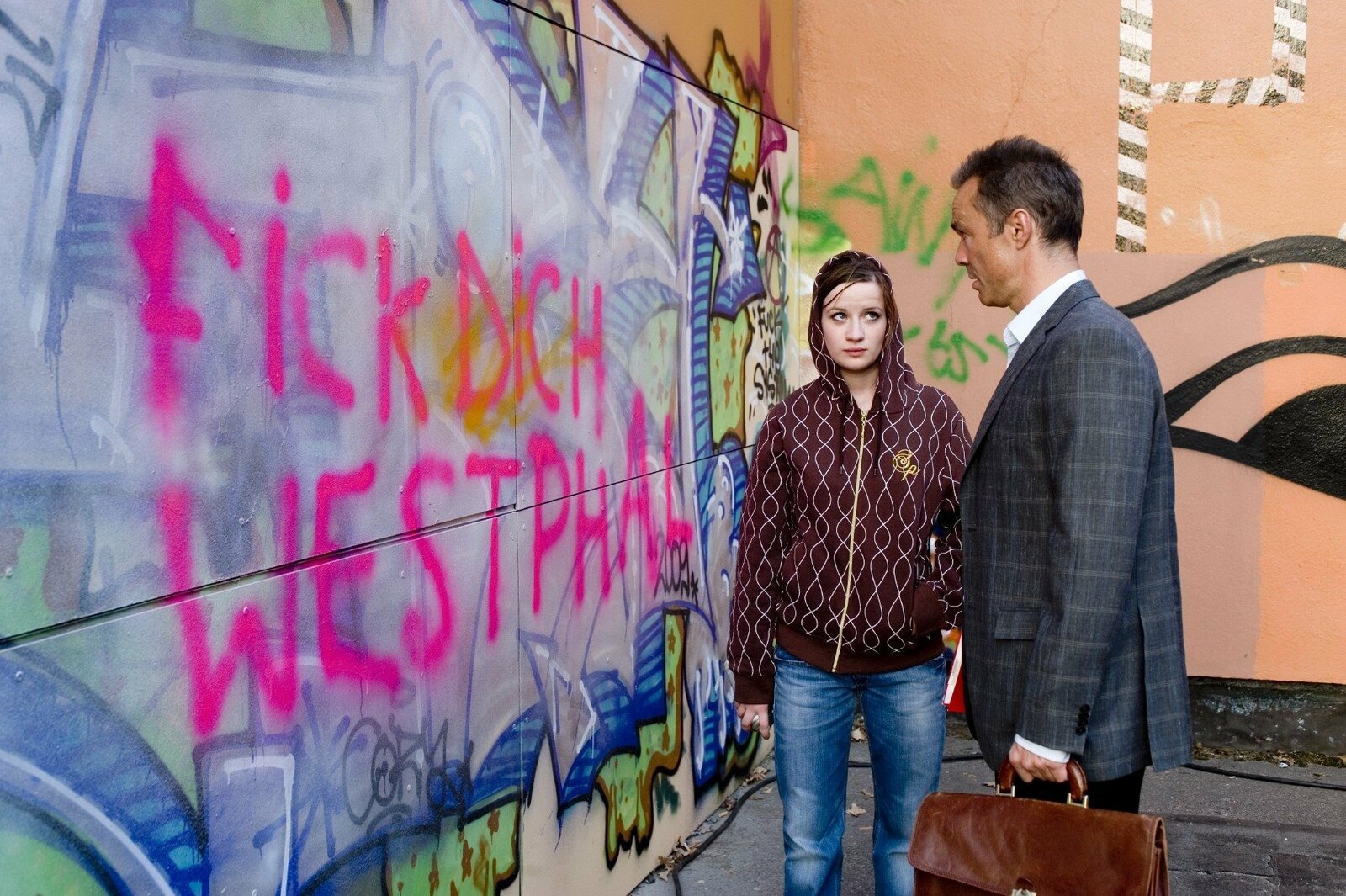 Allein unter SchülernMuss sich nicht nur mit desinteressierten Schülern herumärgern, sondern auch mit solchen, die ihn um jeden Preis wieder loswerden wollen: Auch Harald Westphals (Hannes Jaenicke, r.) älteste Tochter Marla (Nina Gummich, l.) hätte nichts dagegen, wenn ihr Vater der Schule wieder den Rücken kehren würde ...Bild: © ProSieben Media AG Sat.1