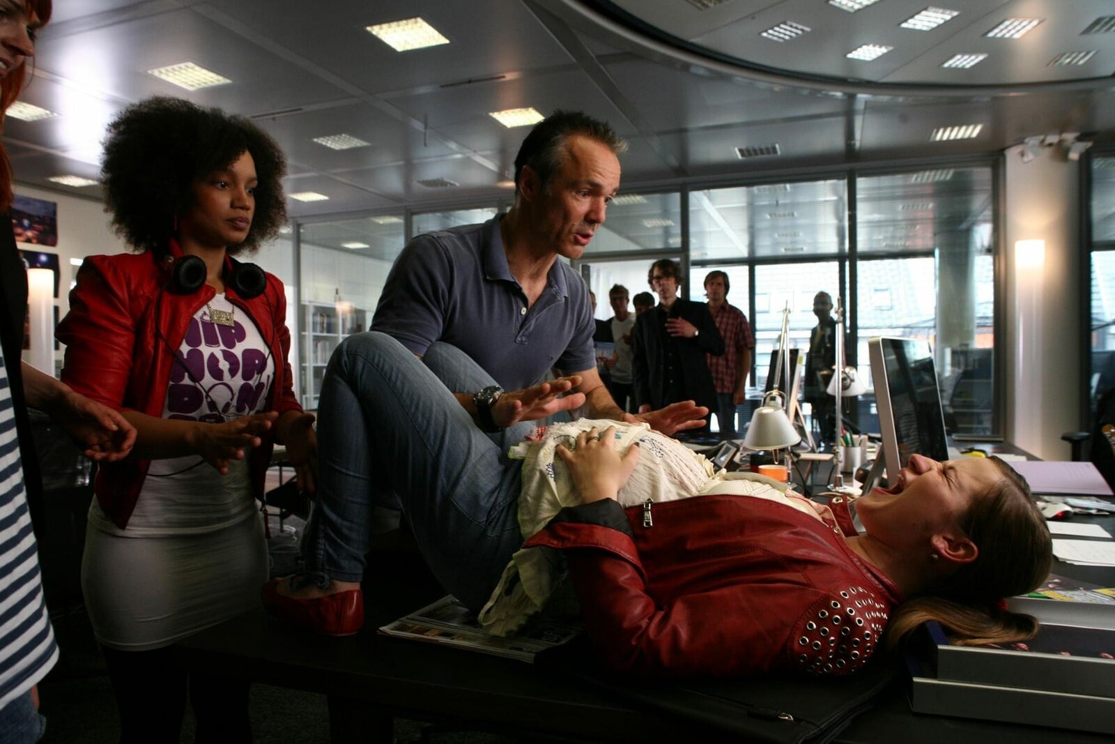 Allein unter MütternAusgerechnet in den Räumen der Redaktion setzen bei Marla (Nina Gummich, r.) die ersten Wehen ein. Für Harald (Hannes Jaenicke, M.) ist dies die einmalige Chance, dem Chefredakteur ein Ultimatum zu stellen: entweder ein Arbeitsvertrag oder eine Geburt auf dem Schreibtisch!Bild: © SAT.1 / Volker Roloff Eigenproduktionsbild frei