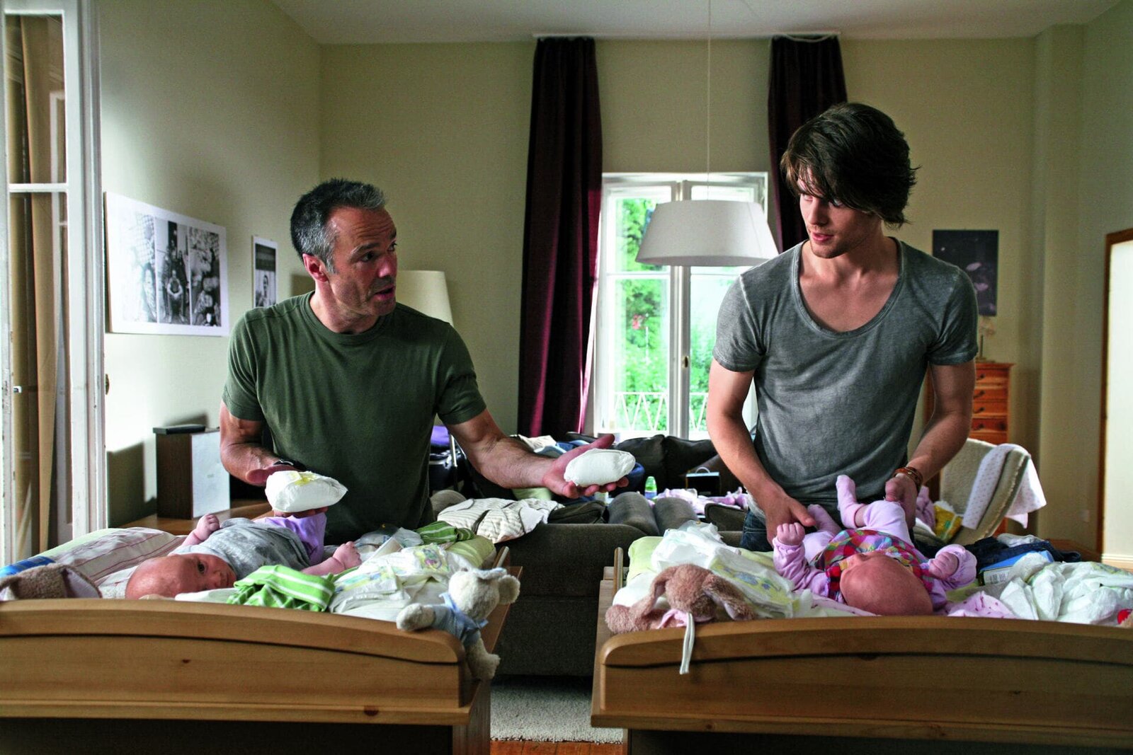 Allein unter MütternKonkurrenz verträgt Harald (Hannes Jaenicke, l.) leider gar nicht. Er hält an seiner Abmachung mit seiner Tochter fest: Die Babybetreuung übernimmt er und sonst niemand! Doch Marlas One-Night-Stand und Vater ihres Kindes, Isko (Johann David Talinski, r.), will die Betreuung seiner Tochter selbst übernehmen.Bild: © SAT.1 / Volker Roloff Eigenproduktionsbild frei