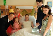 Allein unter ÄrztenHaben Marla (Nina Gummich, 3.v.r.) und Isko (Johann David Talinski, 2.v.r.) die Chance auf eine gemeinsame Zukunft? Harald (Hannes Jaenicke, l.), Sabine (Dana Golombek, 3.v.l.), Floh (Nina Monka, r.) und Töchterchen Ylvie (Merle Johanna Knecht, 2.v.l.) feiern Hochzeit in der Klinik ...Bild: © Sat.1 Emotions