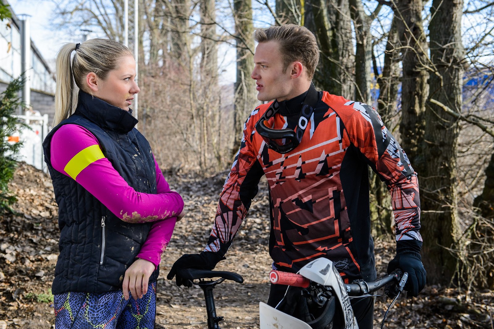 Erster EindruckMarie (Cheyenne Pahde) wird beim Joggen fast von einem vorlauten Mountain-Biker (Robert Maaser überfahren und landet im Matsch.Bild: © RTL / Willi Weber