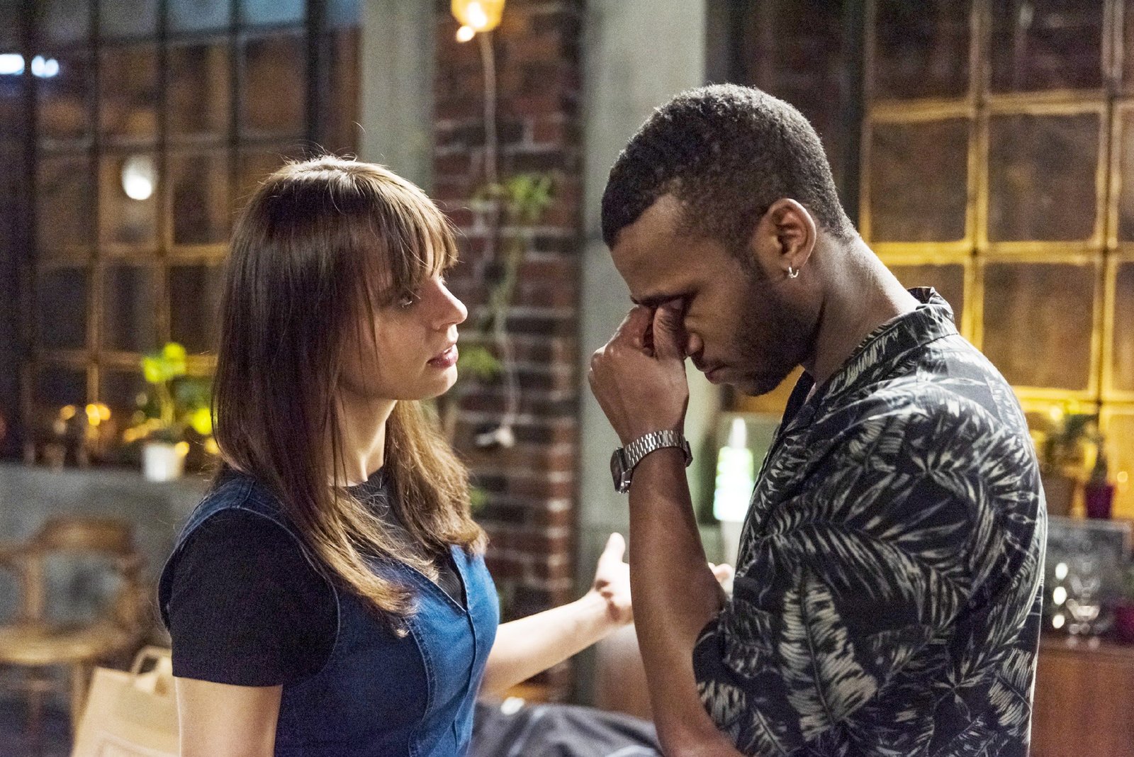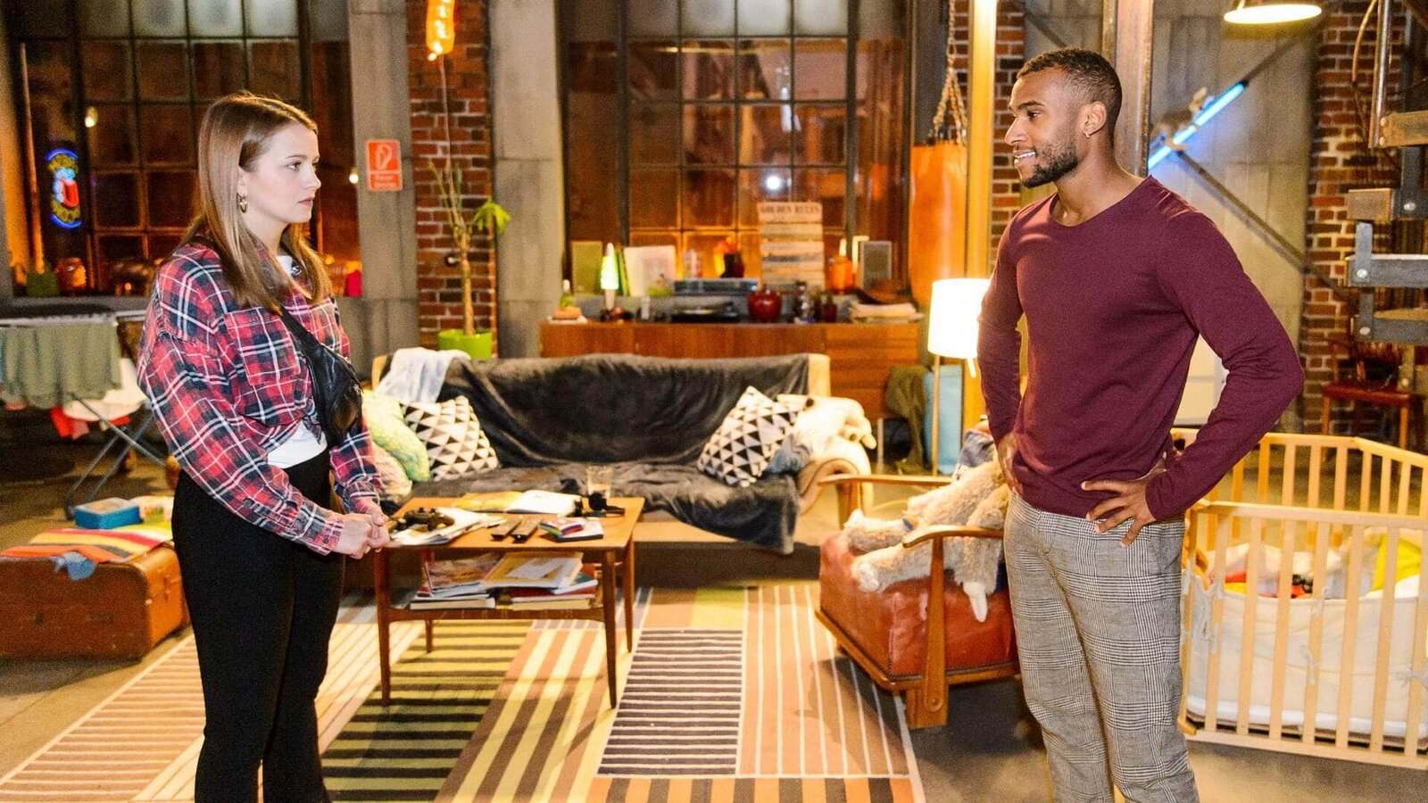 Yannick bittet Lucie, Ina mit ihren Schulden zu helfenDer Streit zwischen Lucie (Julia Wiedemann) und Moritz (Tijan Njie) fährt sich fest.Bild: © TVNOW / Julia Feldhagen