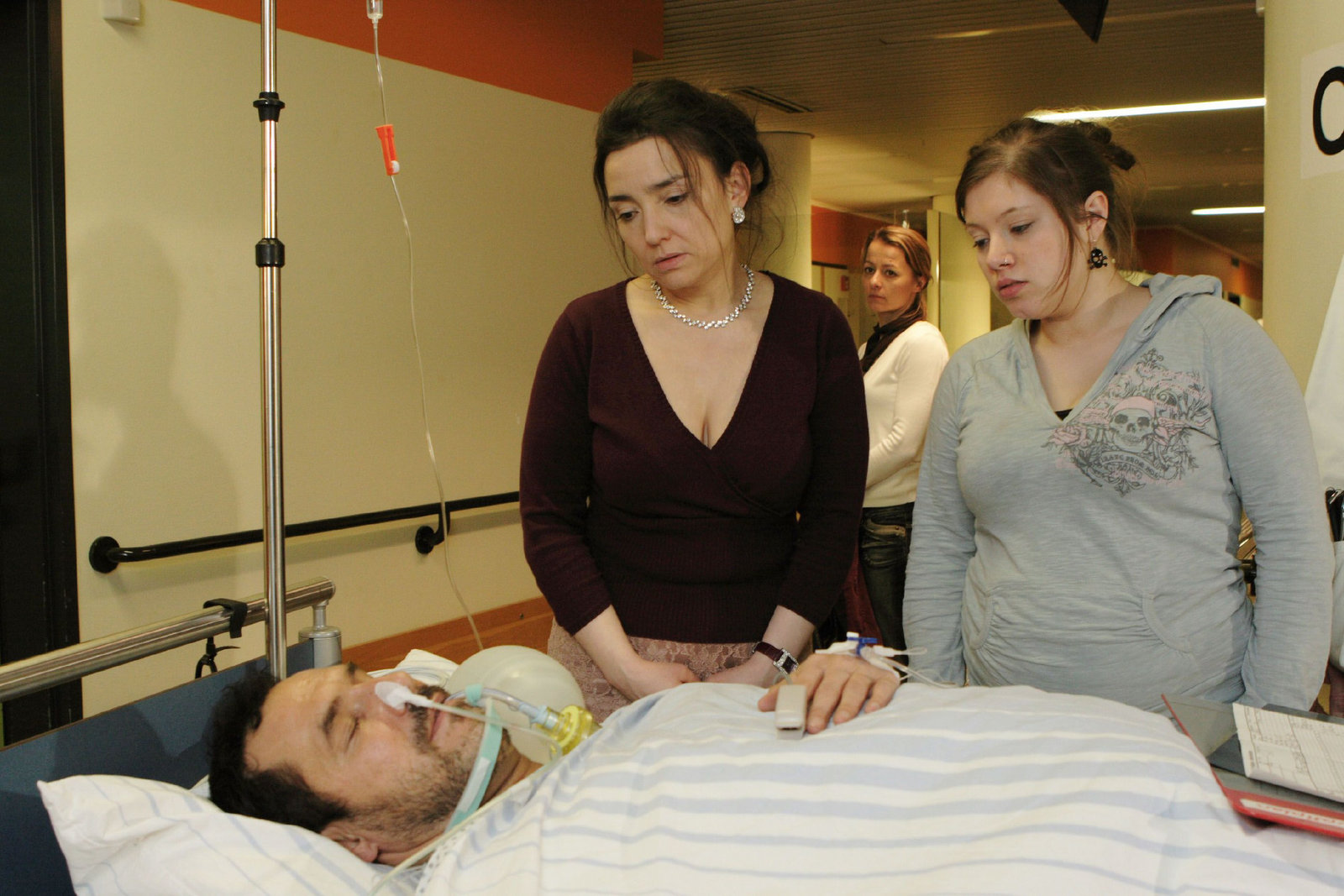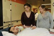 Julian ist verzweifeltRichard (Silvan-Pierre Leirich, lieg.) hat die Operation überstanden. Simone (Tatjana Clasing, l.) und Vanessa (Julia Augustin) sind noch fassungslos. Auch Nadja (Regine Seidler, Hintergrund) ist ins Krankenhaus gekommen.Bild: © TVNOW / Frank Hempel
