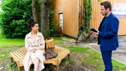 Eine knallharte AnsageJenny (Kaja Schmidt Tychsen, M.) verfolgt das Gespräch zwischen der Reporterin Sabine Bangert (Selly Meier, l.) und Marie (Cheyenne Pahde) und ist aufgrund ihrer Eifersucht kurz davor, ihre professionelle Maske zu verlieren.Bild: © TVNOW / Julia Feldhagen