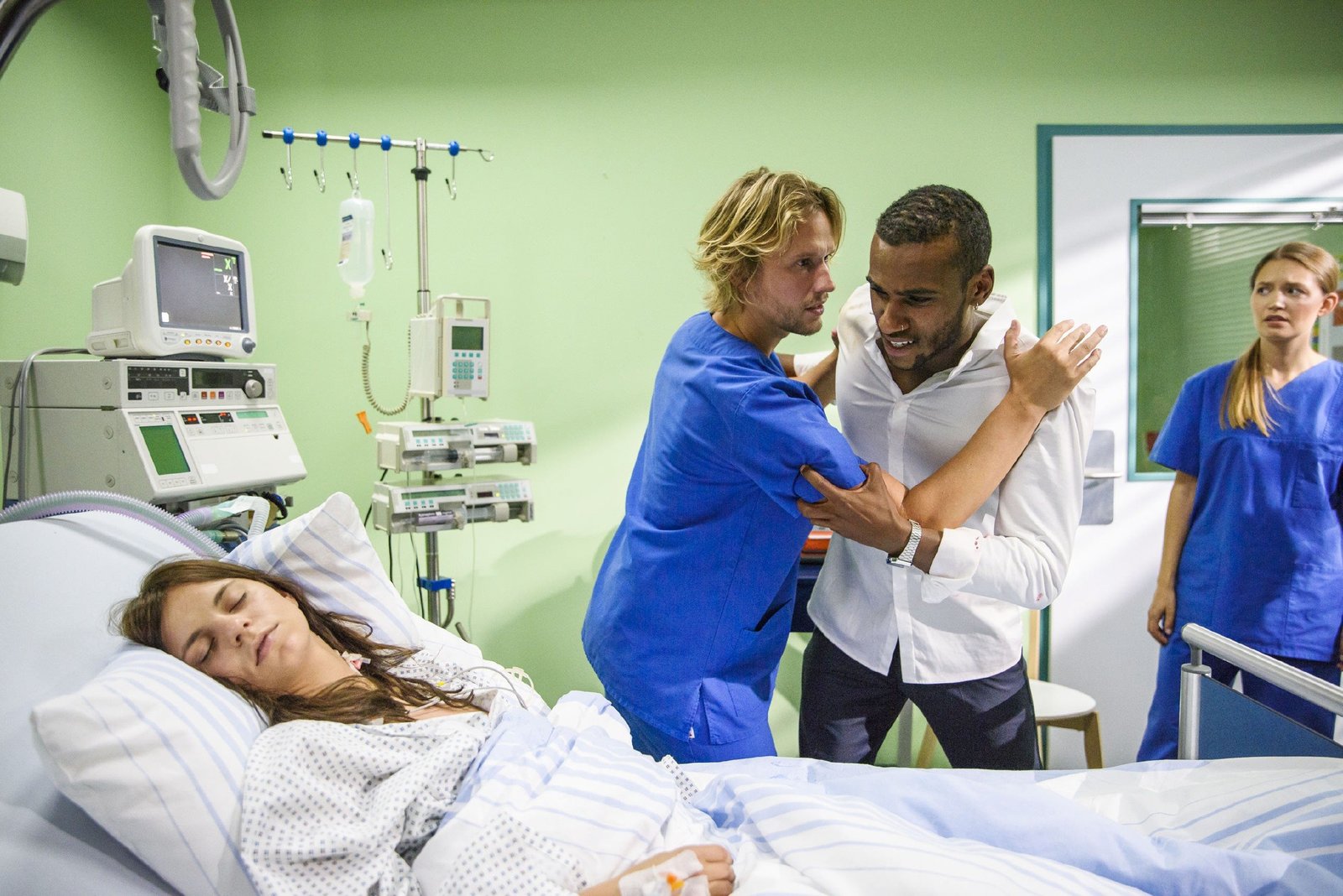 Michelles ZustandFinn (Christopher Kohn, 2.v.l.) muss Moritz (Tijan Nije) zurückhalten, der nichts für Michelle (Franziska Benz, l.) tun kann.... (r. Amrei Haardt als Nathalie (Amrei Haardt)Bild: © TVNOW / Julia Feldhagen