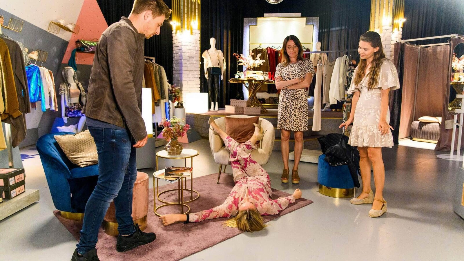 Daniela findet in Marians Wohnung einige LiebesbriefeIsabelles (Ania Niedieck, lieg.) kleine Notlüge sorgt für mehr Aufsehen als ihr lieb ist. Links Yannick (Dominik Flade), hinten Daniela (Berrit Arnold), rechts Nathalie (Amrei Haardt)Bild: © TVNOW / Julia Feldhagen