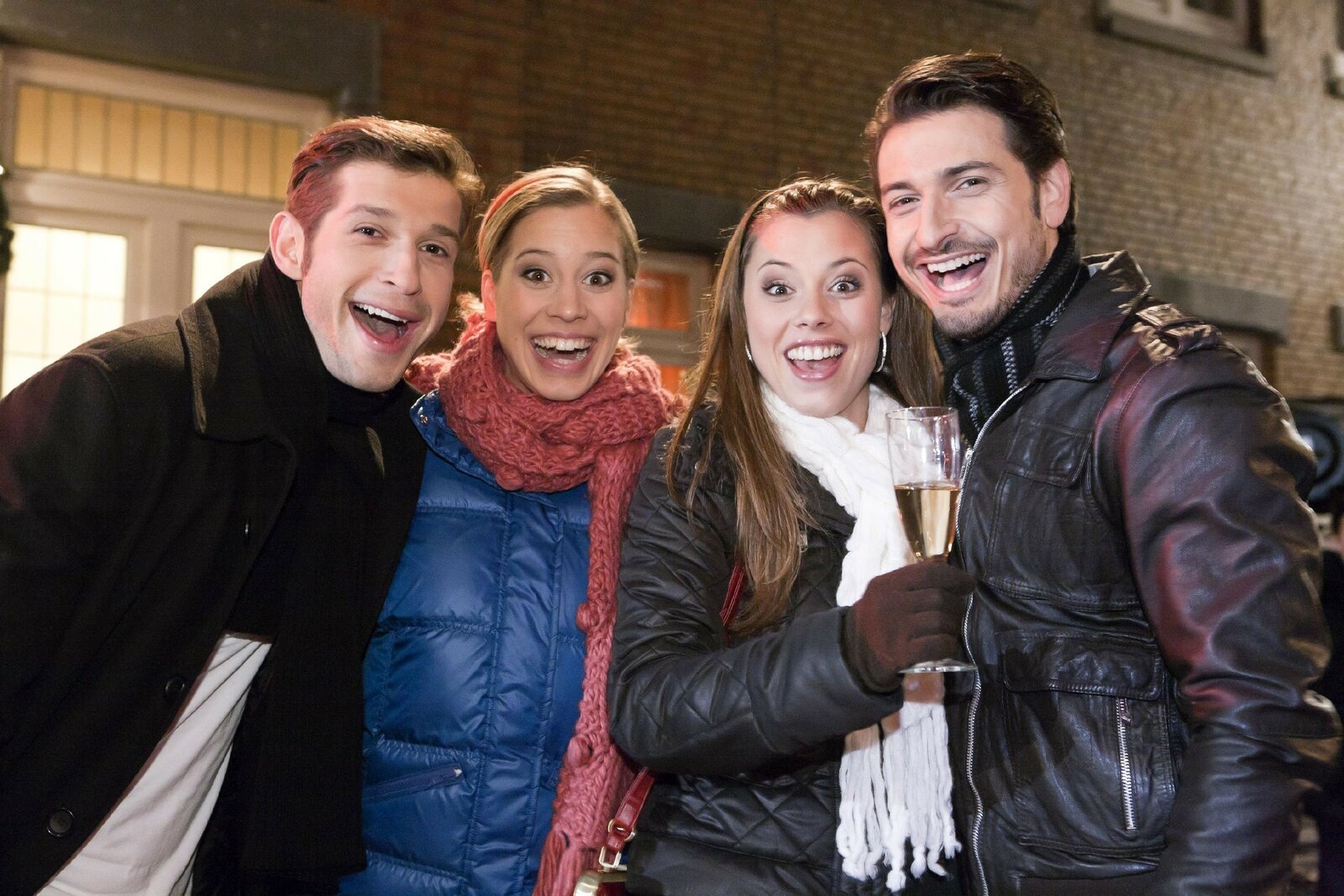 Frohes neues Jahr, liebe Familie Steinkamp!(v.li.) Deniz (Igor Dolgatschew), Sarah (Christina Siemoneit), Melanie (Anna-Katharina Fecher) und Marco (Salvatore Greco) haben sich draußen versammelt, um gemeinsam auf das neue Jahr anzustoßen.Bild: © RTL / Kai Schulz