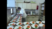 Schrothen in Oberstaufen: Reportage aus einem bayerischen Kurort1995: Schroth-Kur in Oberstaufen. Karges Essen dominiert den Alltag. Im Bild: der Koch richtet das Abendessen an, d.h. rohe, geraspelte Karotten und kleingehackte Kräuter.Bild: © NDR, BR / BR/NDR