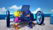 Der FahrraddiebAlvin (l.) und Simon besteigen als Superhelden für den Wettbewerb das von Simon entworfene Munk-Mobil.Bild: © SUPER RTL